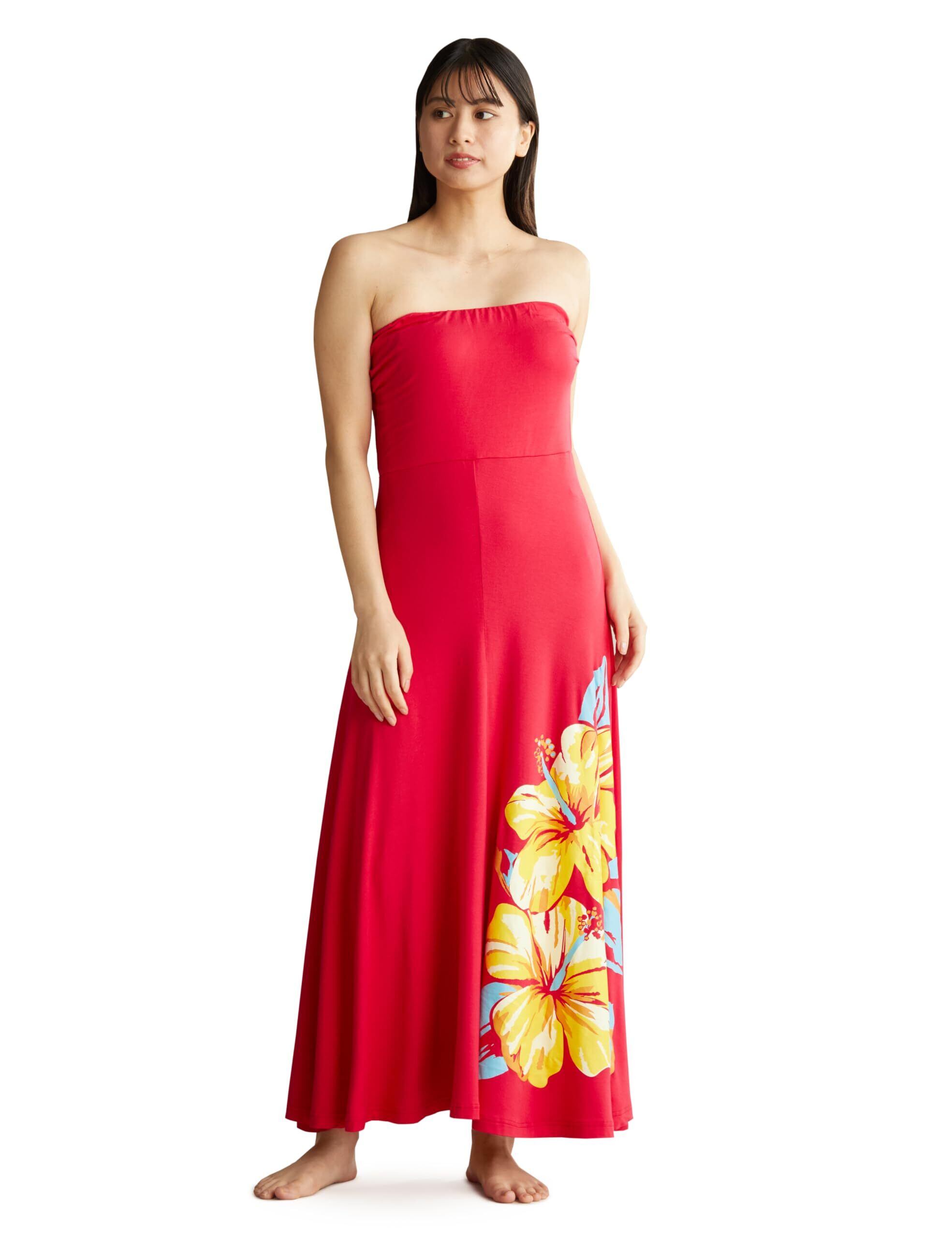 まるでシルクのように体を優しく包み込む、極上のフィット感。程良い重みがしなやかなドレープを生み出し、優美な舞を演出します。 ストレッチ素材のドレスに色彩豊かなハイビスカス柄が、ステージを華やかに彩ります。