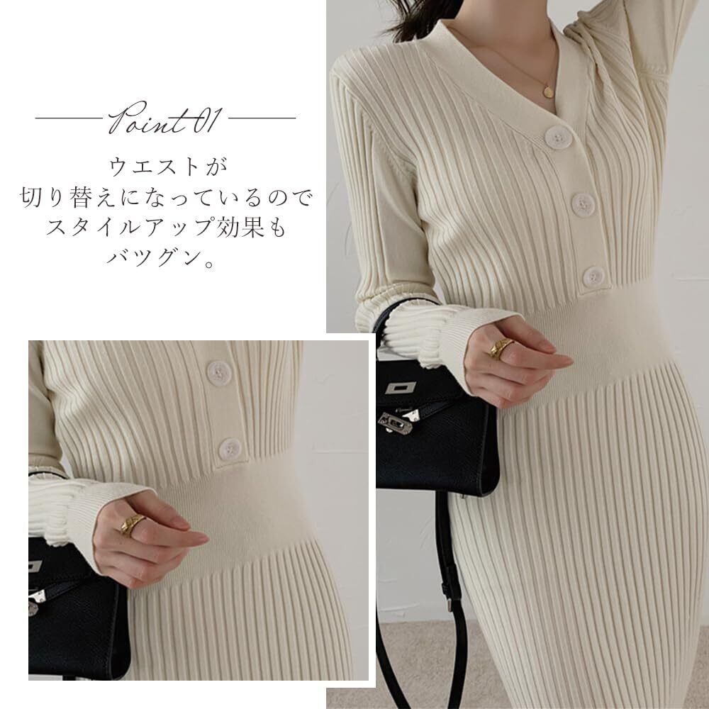 【Design】 女性らしいボディラインが美しい上品なニットワンピース。 ウエストが切り替えになっているのでスタイルアップ効果もバツグン。