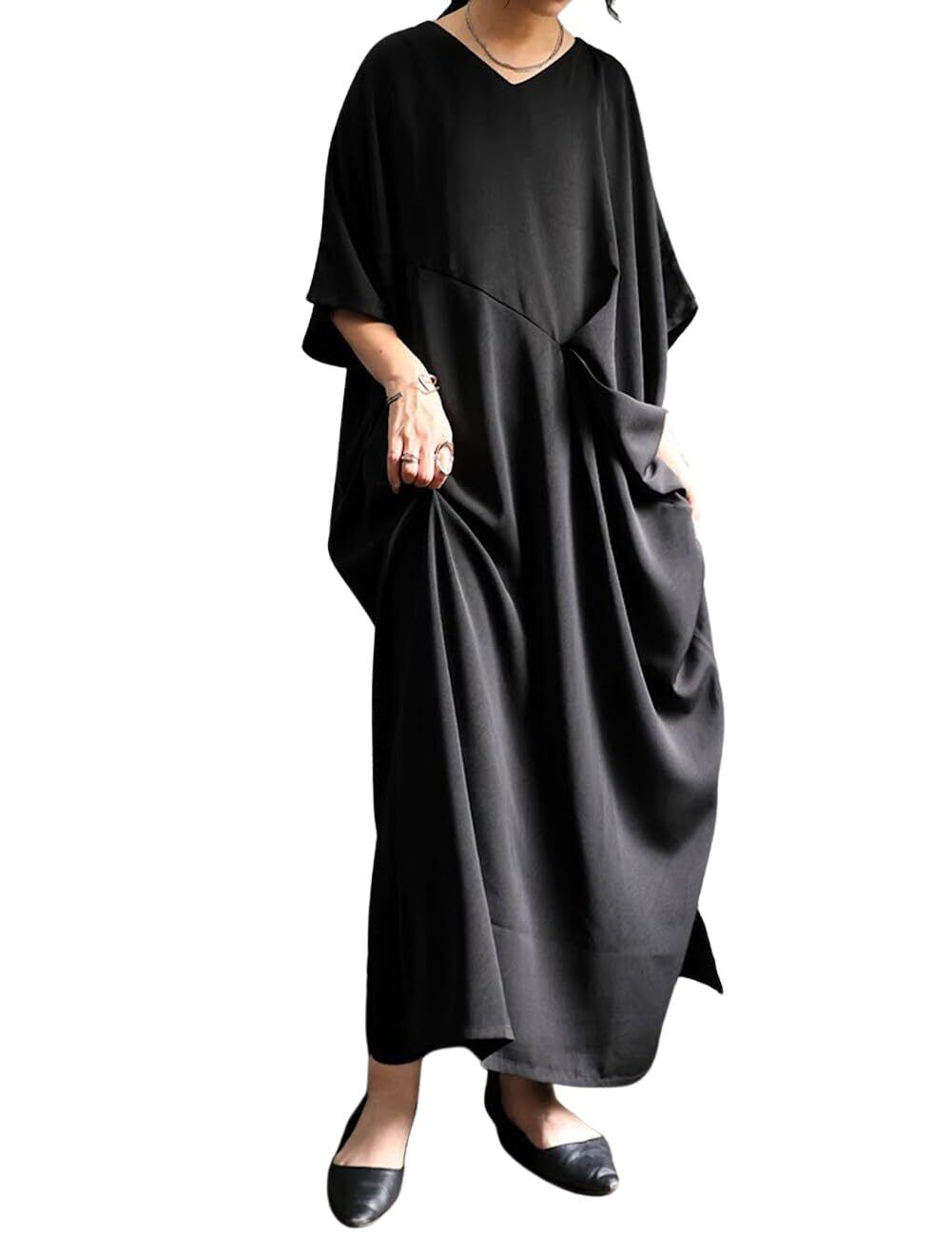 ≪DETAIL≫・ドレッシーで上品なアシメデザイン。・リラクシーなドルマンスリーブ。・顔周りすっきり見せ叶えるVネック。・ボディラインを拾わないゆるっとシルエット。・便利な両サイドポケット付き。・足さばきらくちんな裾スリット入り