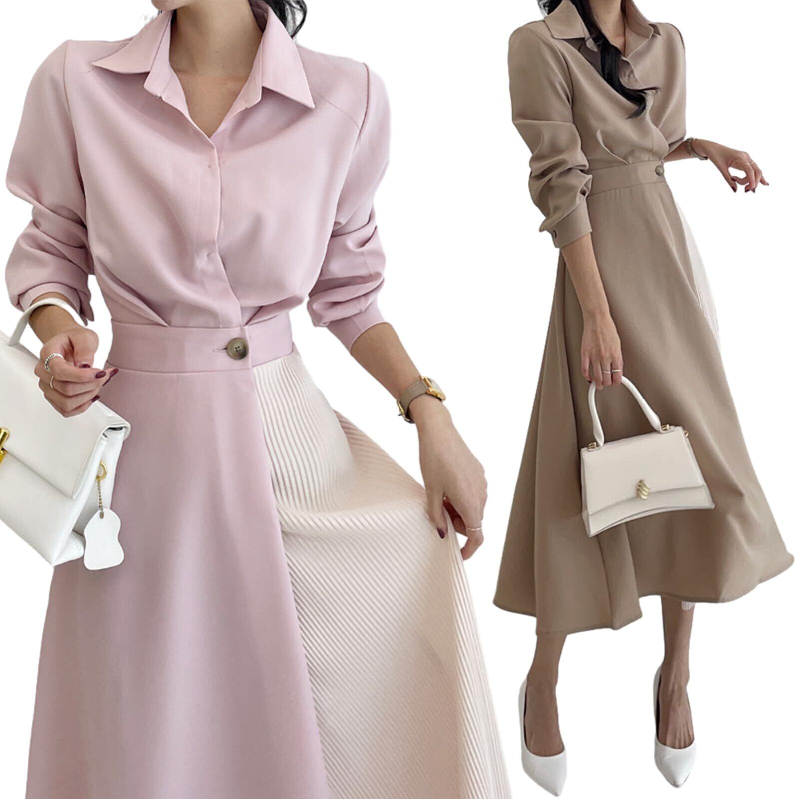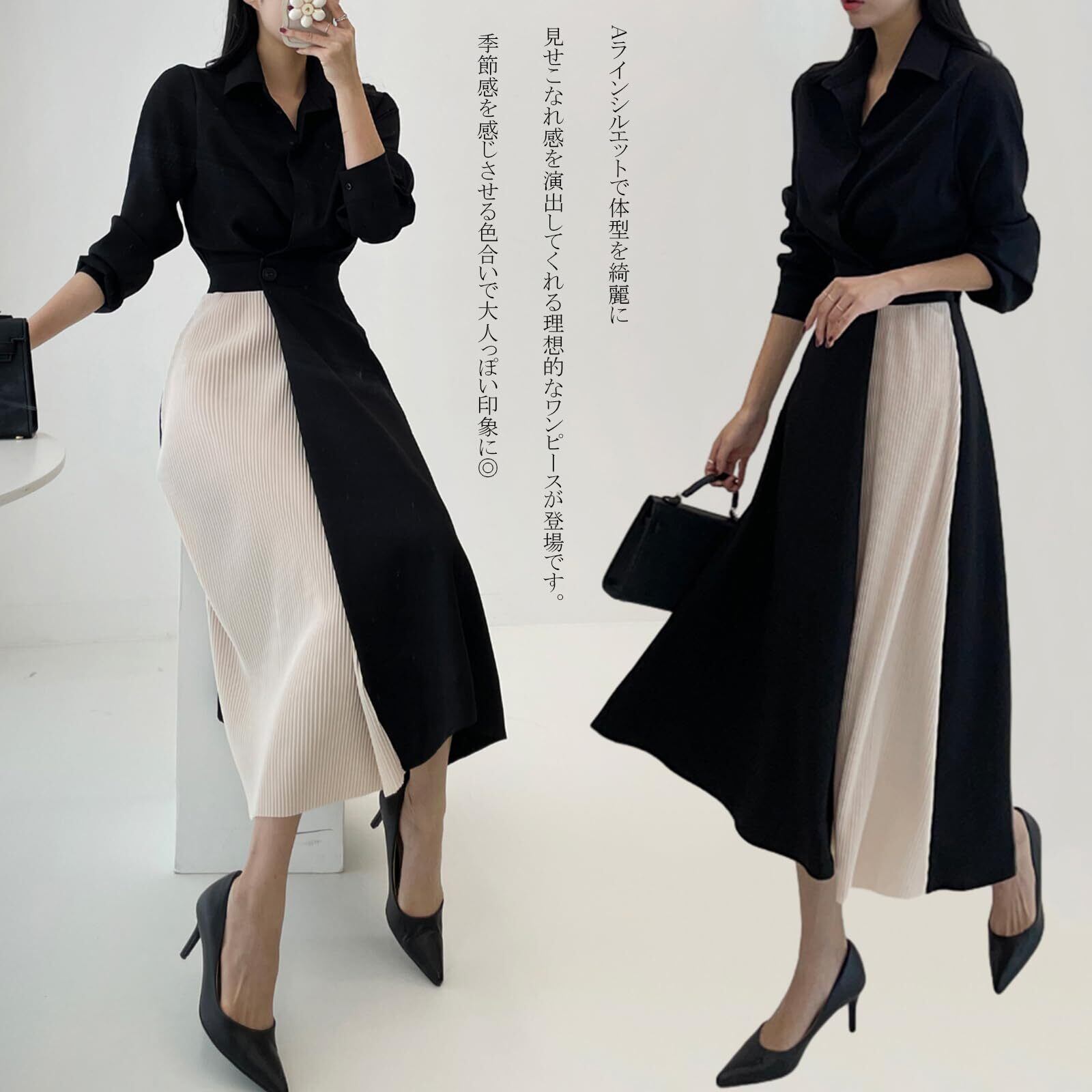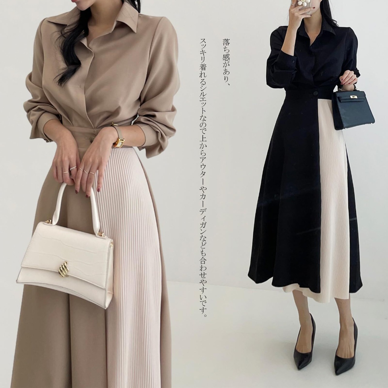 【数量限定】[CCGGOWMM] ロング ワンピース レディース 長袖 シャツ ワンピース 異素材 ドッキング 切り替えチュニックドレス 大人 可愛い Aライン ワンピース 春 夏 秋 カジュアル プリーツ ワンピース 冬 | BOSSO