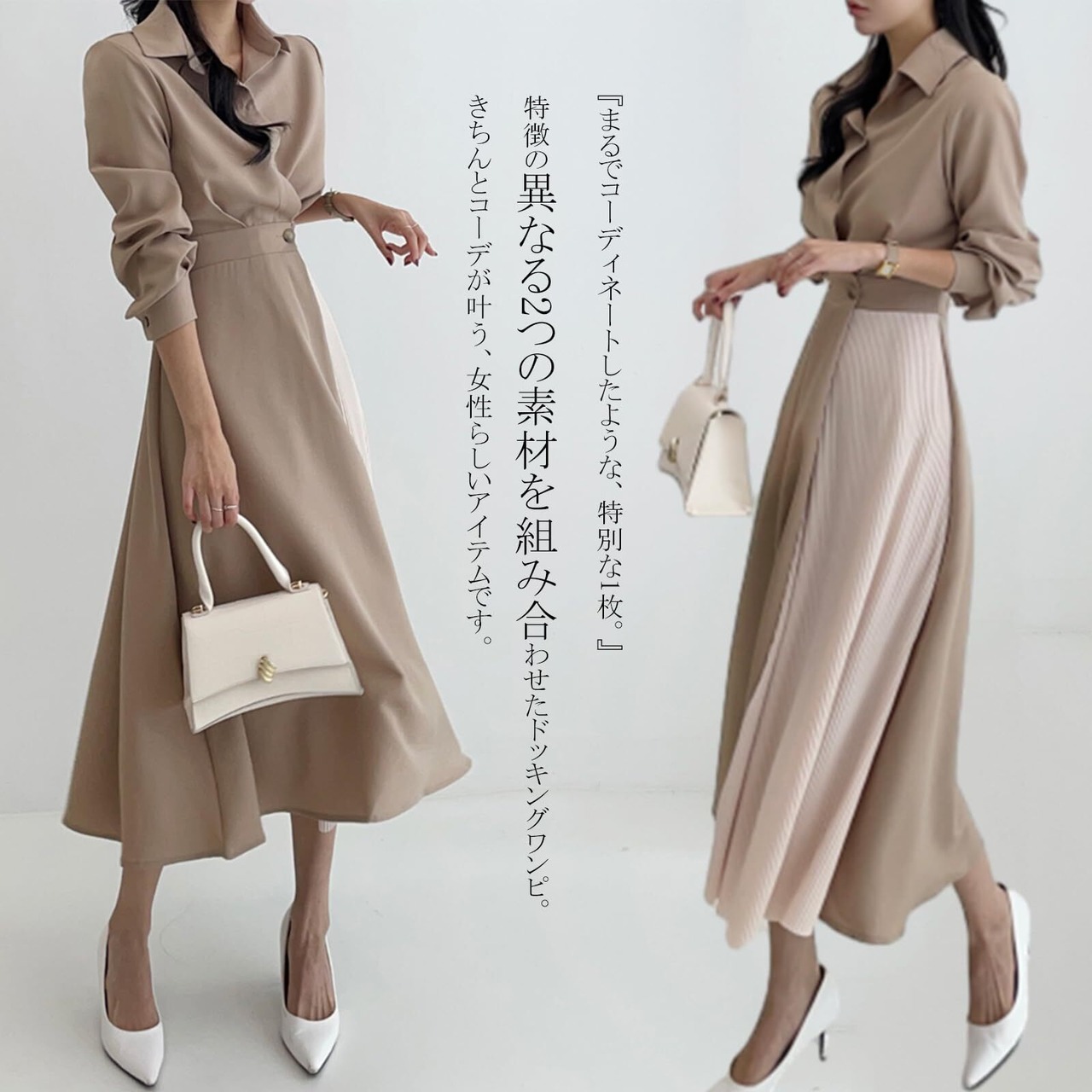 [CCGGOWMM] ロング ワンピース レディース 長袖 シャツ ワンピース 異素材 ドッキング 切り替えチュニックドレス 大人 可愛い Aライン ワンピース 春 夏 秋 カジュアル プリーツ ワンピース 冬