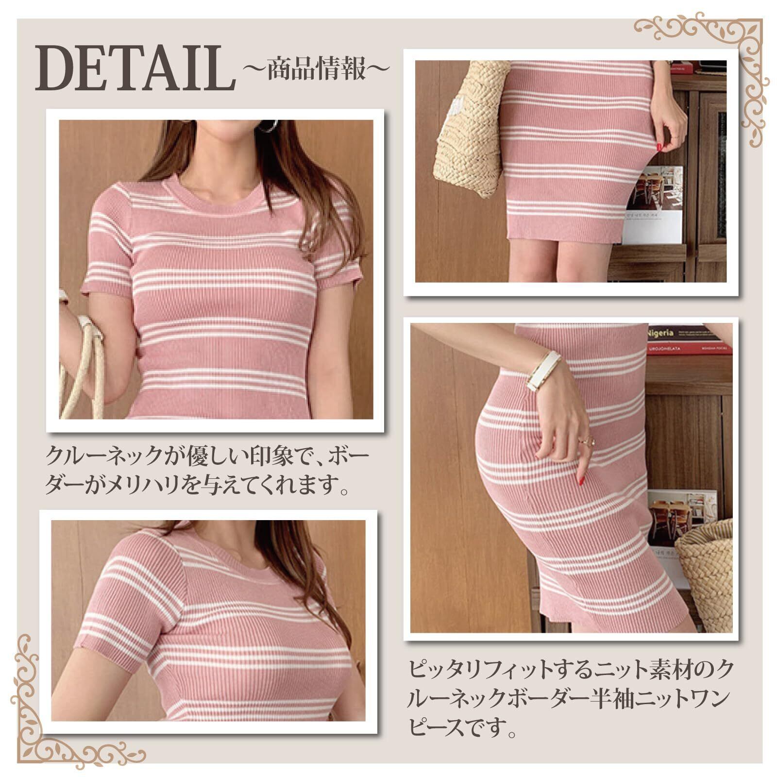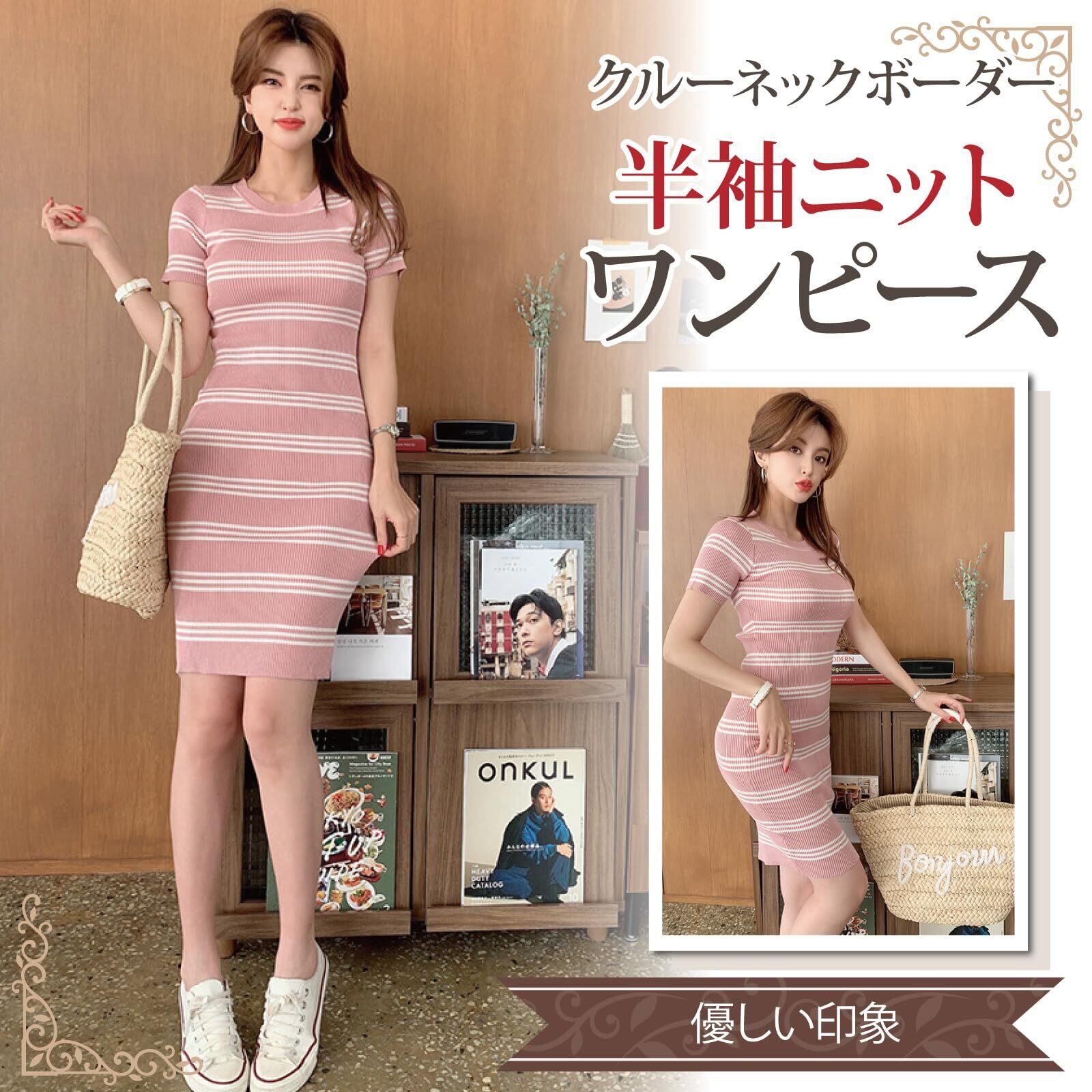 クルーネックボーダー半袖ニットワンピース(キャバドレス・CABARETDRESS)。クルーネックが優しい印象で、ボーダーがメリハリを与えてくれます。ピッタリフィットするニット素材なので、全体をスタイリッシュに魅せONもOFFもスタイルを選ばないワンピです。
