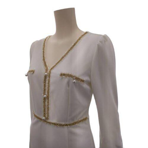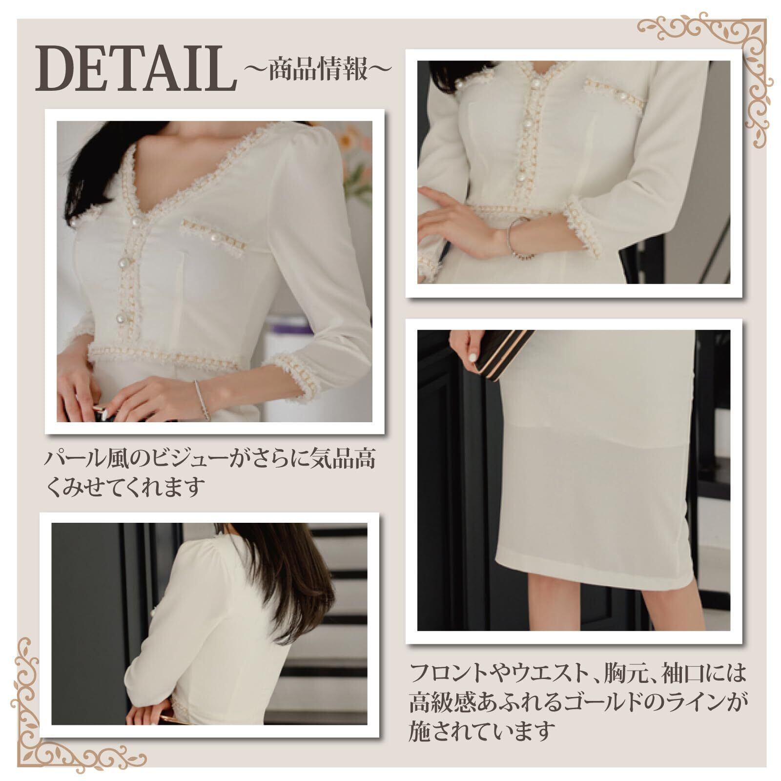 ホワイトに映えるゴールドのラインが高級感を漂わせるワンピース(キャバドレス・CABARETDRESS)。フロントやウエスト、胸元、袖口には高級感あふれるゴールドのラインが施されています。ウエストラインをマークすることで引き締まったボディラインを強調することができます。パール風のビジューがさらに気品高くみせてくれます。程よいゆとりをもたせたサイズ感、さらりとしたソフトタッチの素材で着やすさにも拘っています。七分丈の袖がこれからの季節にぴったりの爽やかデザインです。