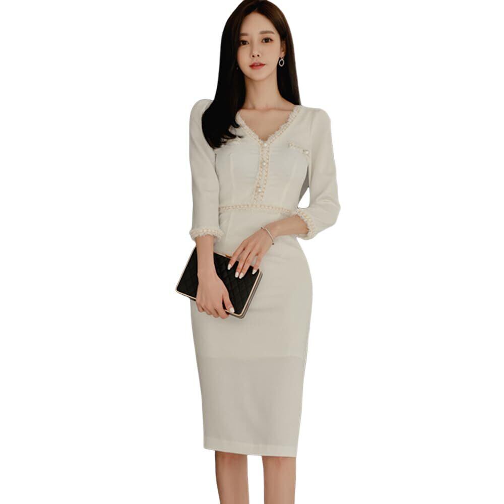 [GRAXIA] 【グラシア】キャバドレス ミディアムドレス ハイウエスト タイト ワンピース キャバ嬢 キャバクラ ラウンジ 七分袖 ビジュー パール 膝丈 レディース