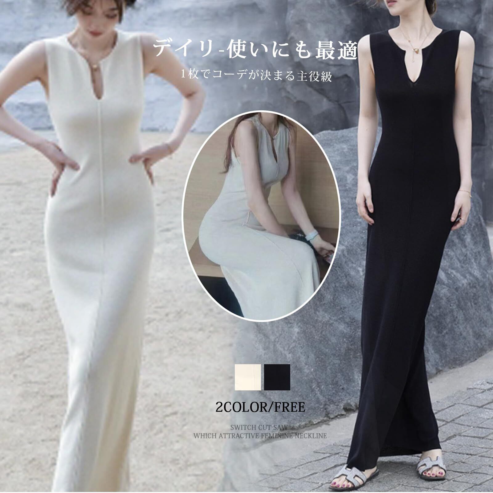 [MERONOCALLALY] ニットワンピース レディース ノースリーブ Vネック マキシ丈 柔らかい ストレッチ 無地 カジュアル 細身 おしゃれ きれいめ 秋