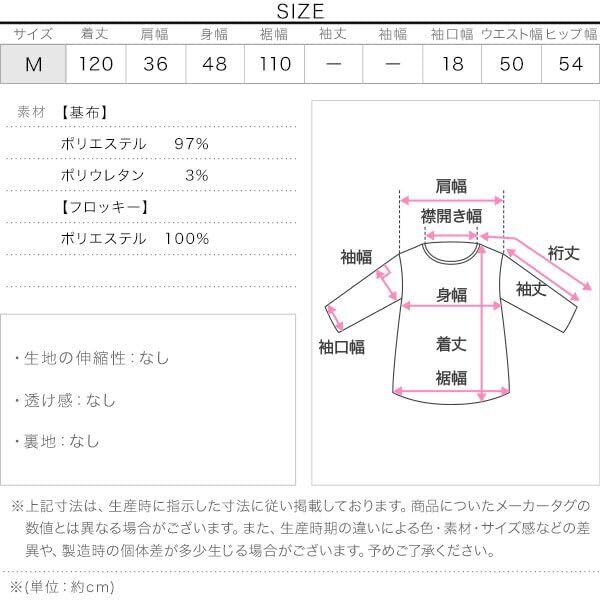 着丈 120、肩幅 36、身幅 48、ウエスト幅 50、ヒップ幅 54、裾幅 110、袖口幅 18