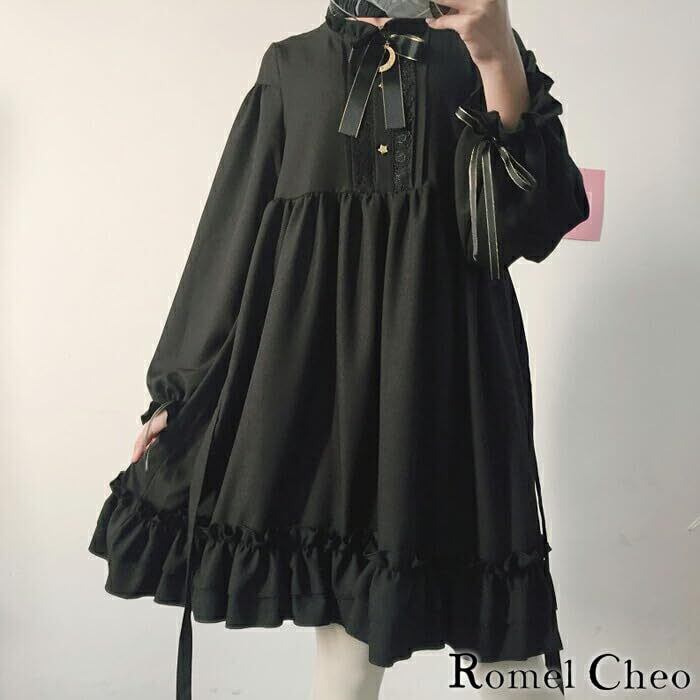 [RomelCheo] ゴシック ロリータ ゴスロリ ワンピース フリル リボン ミニ ドレス ワンピ ブラック 黒ゴス aライン 膝上丈 長袖 服 レディース ティーンズ 原宿系 病みかわ ゆめかわ ガーリー 大人可愛い ロメルチェオ