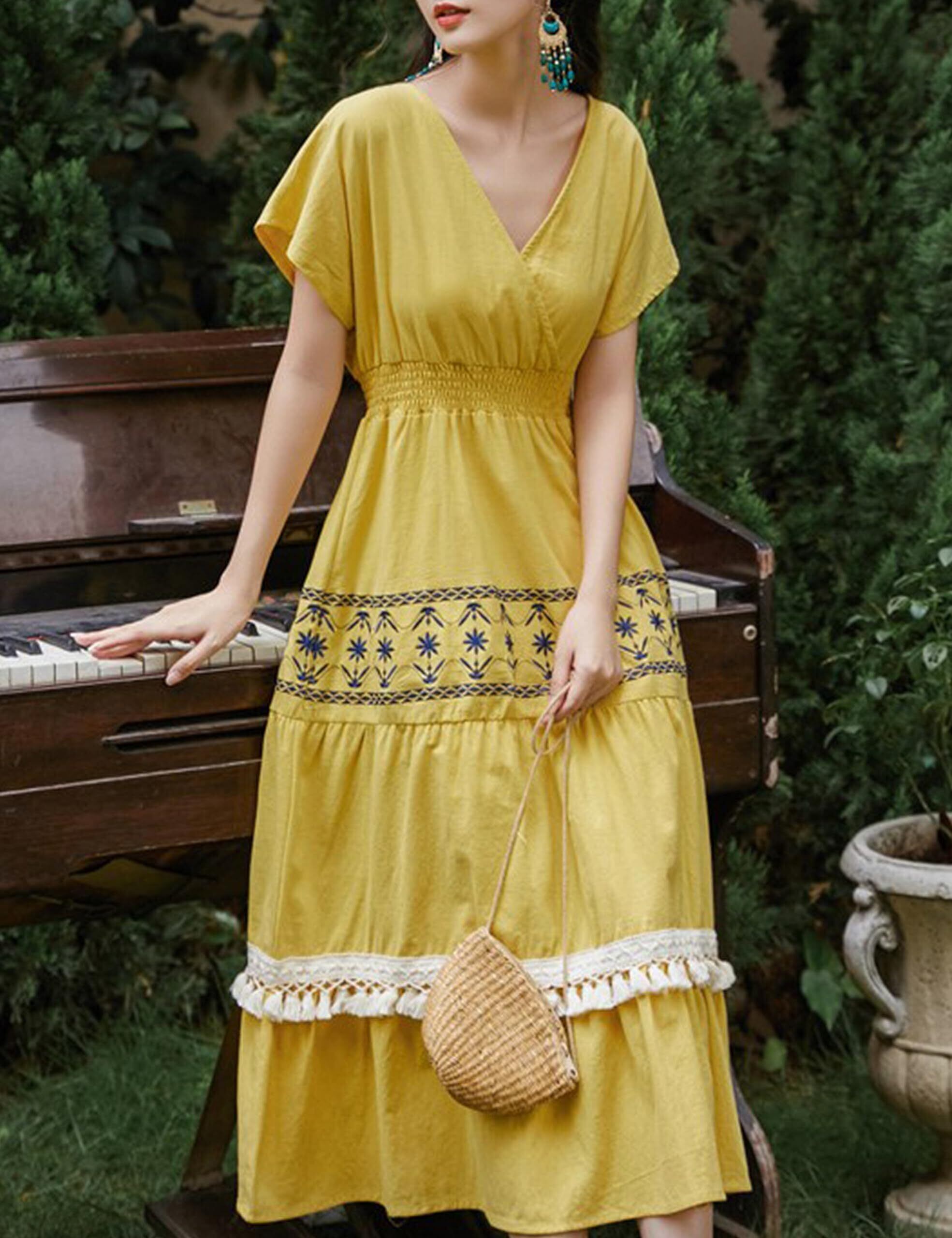 【新春セール】[Orolay] ワンピース レディース ドレス ロングワンピース 夏ワンピース コットンリネンワンピース リゾートワンピース 綿麻 夏服 フレア裾 半袖 vネック 刺繍 可愛い ゆったり 旅行 部屋着 日常着 | BOSSO