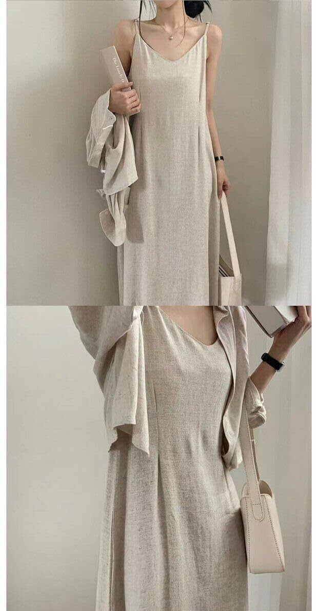 【新着商品】[JINJUDUO] レディース キャミソール ワンピース 春 秋 Vネック ロング ゆったり ファッション 綿麻 ベジタリアン 体型補正 薄手 スーツ ニット キャミソールワンピース かわいい 2点セット | BOSSO