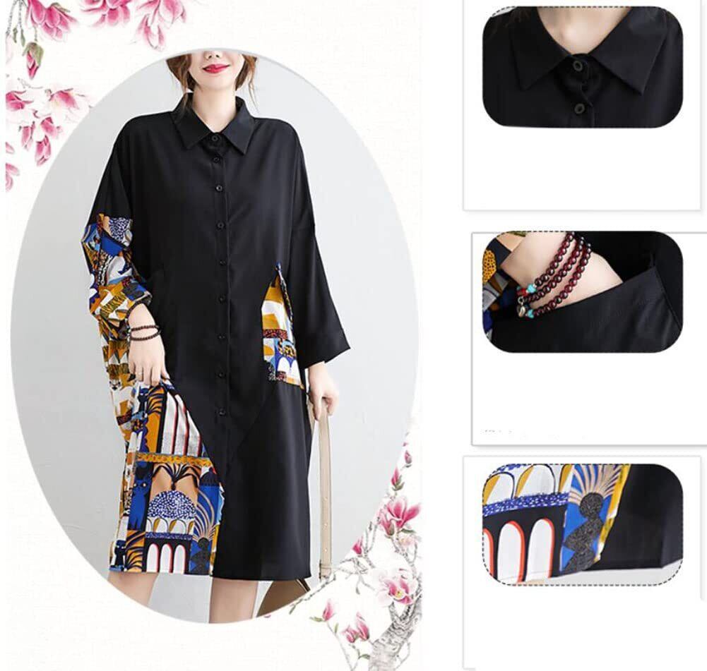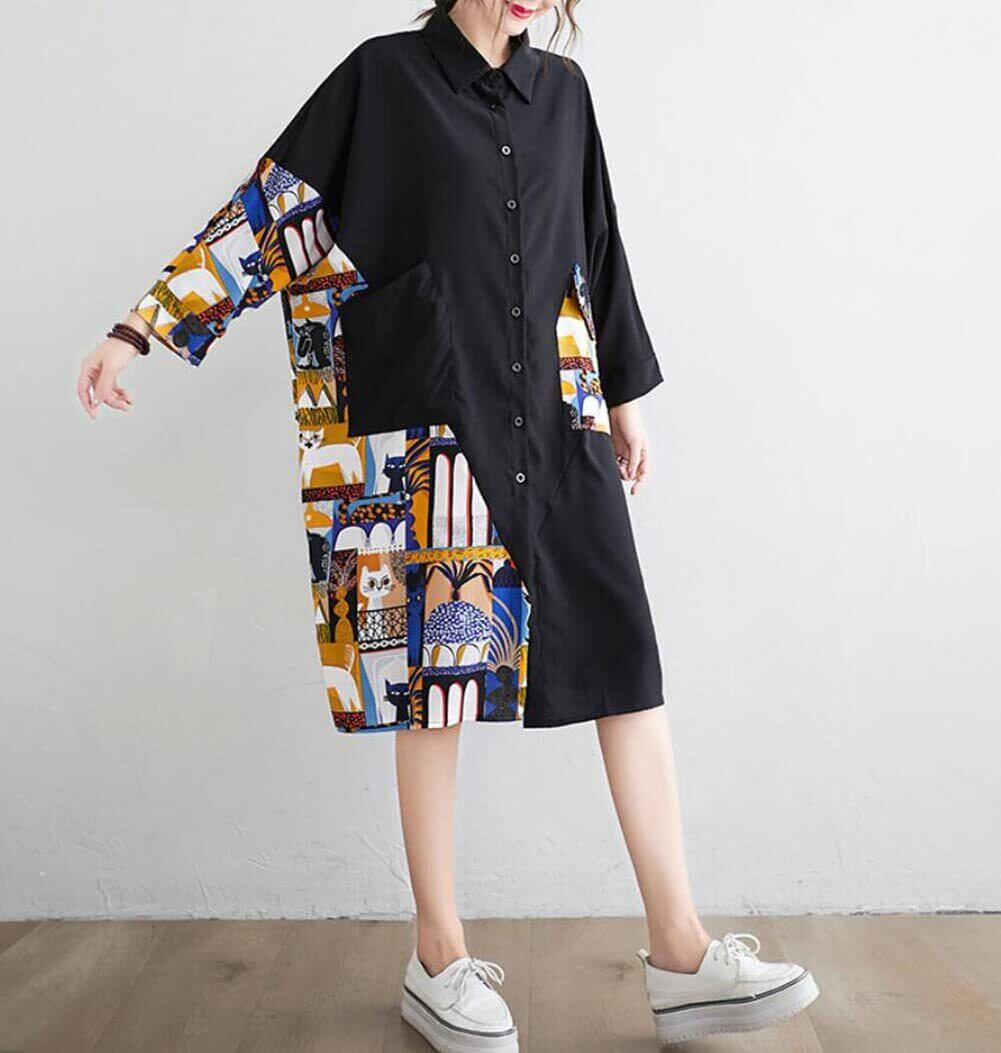 [PPEIREE] シャツ ワンピース レディース チュニック ゆったり バイカラー 切り替え ワンピース 着痩せ プリント ルーズシルエット シャツ チュニック