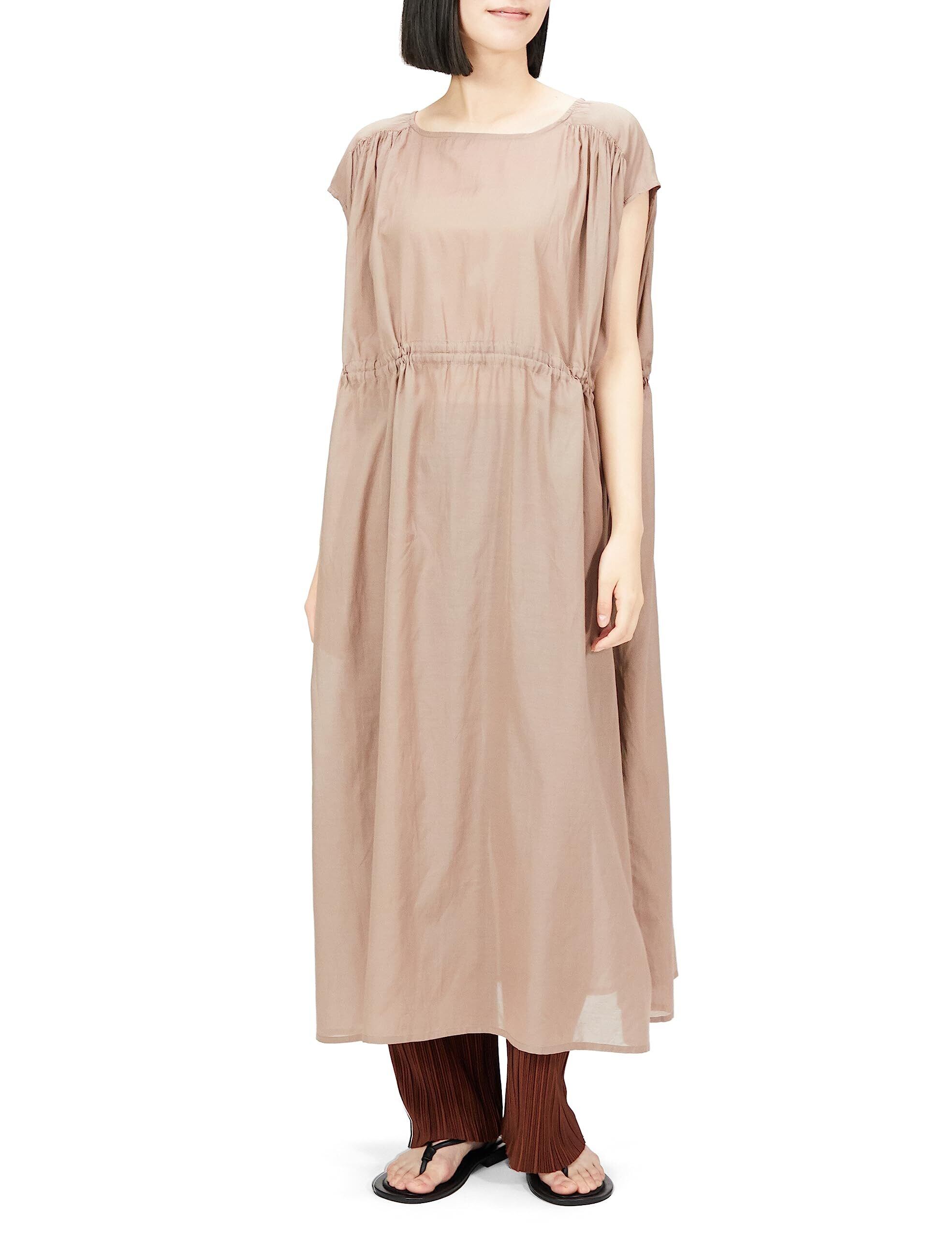 ウエストリボンを絞って、ギャザーを寄せて着用するタイプのワンピースです。パンツとのレイヤードで、夏らしい着こなしに。ストレートでもスキニーでもレイヤードには、おススメ!