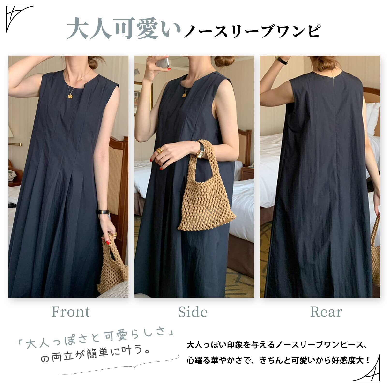 【春夏に欠かさないワンピース】着るだけでときめきを誘うレディに欠かせない絶対要素—ロングワンピース。上品な印象を作るノースリーブワンピース。一見甘い見た目でも上品なデザインで子どもっぽくならない。ブルー、ブラック、ベージュ、ネイビーのお洒落な4色をご用意。普段の通勤はもちろん、フォーマルにも堂々と活躍できる万能カラーは使い勝手抜群!春夏に欠かさないワンピース。