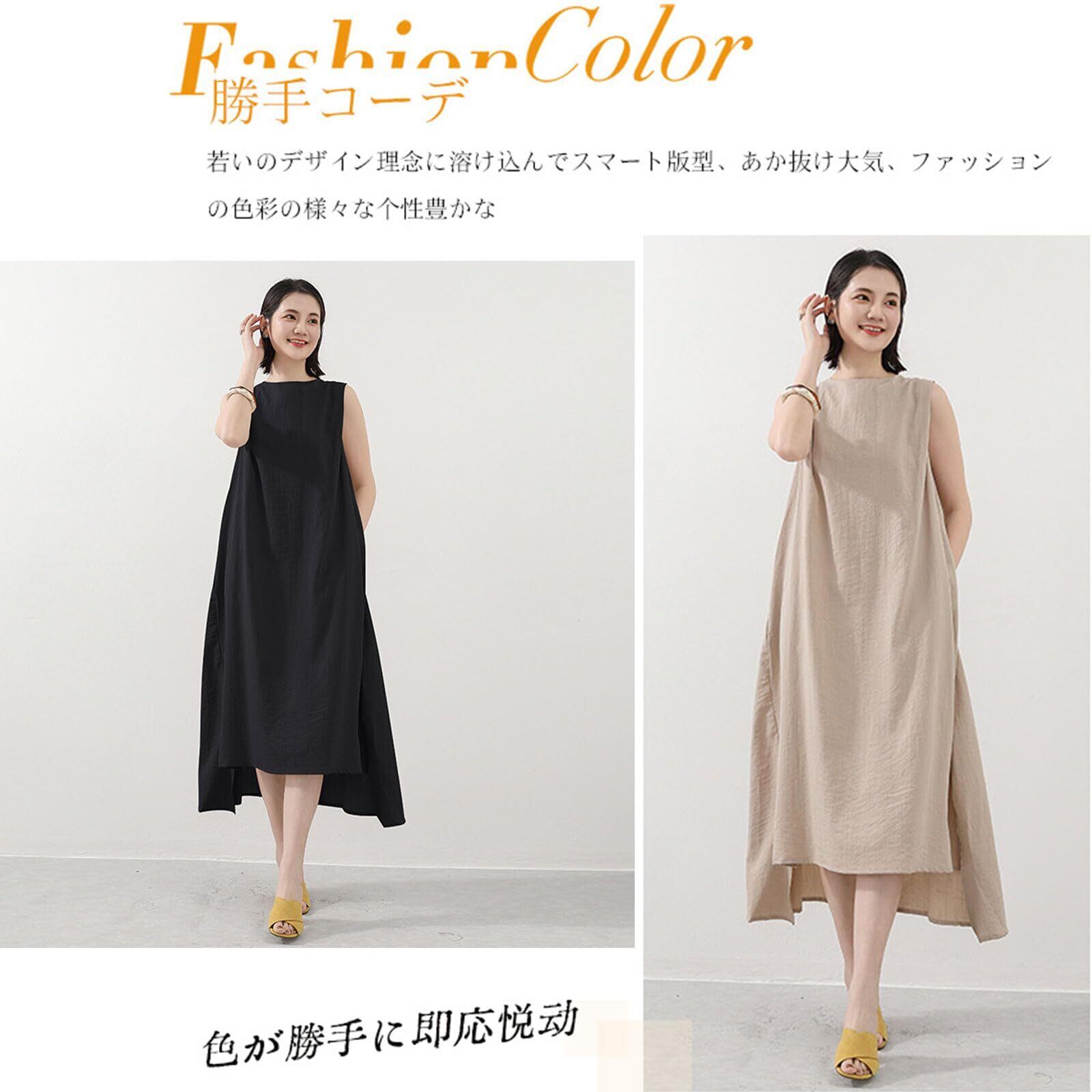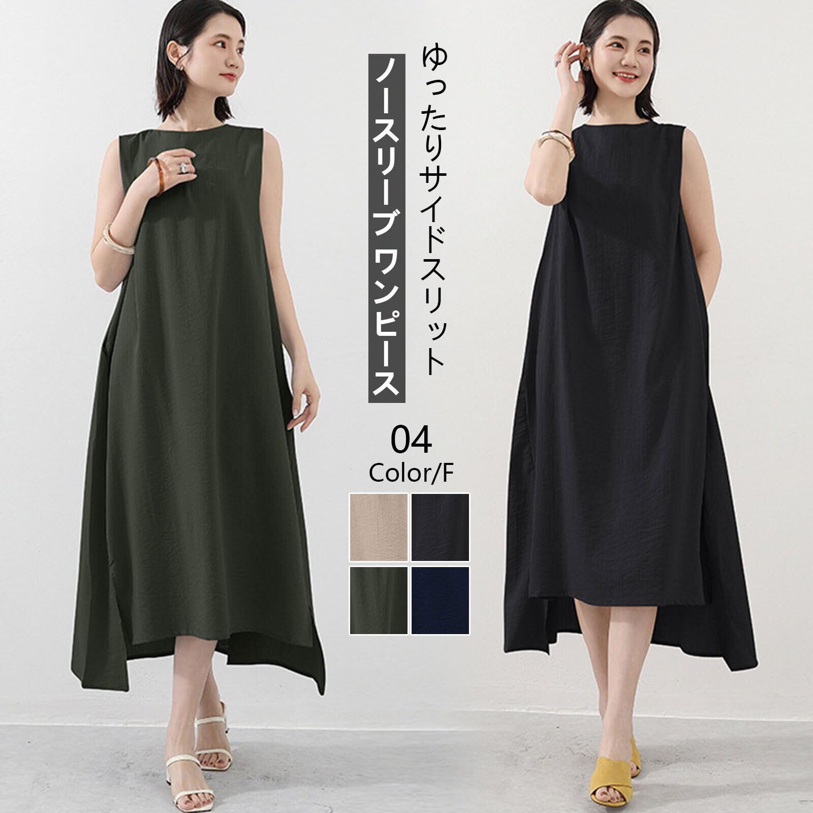 [7-livehouse] ワンピース レディース ロング丈ワンピース ノースリーブ ラウンドネック ポケット付き サイドスリット 大きいサイズ カジュアル ゆったり 体型カバー お洒落 可愛い 無袖 無地 夏服 着痩せ 通勤