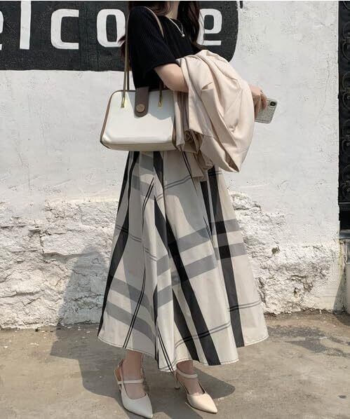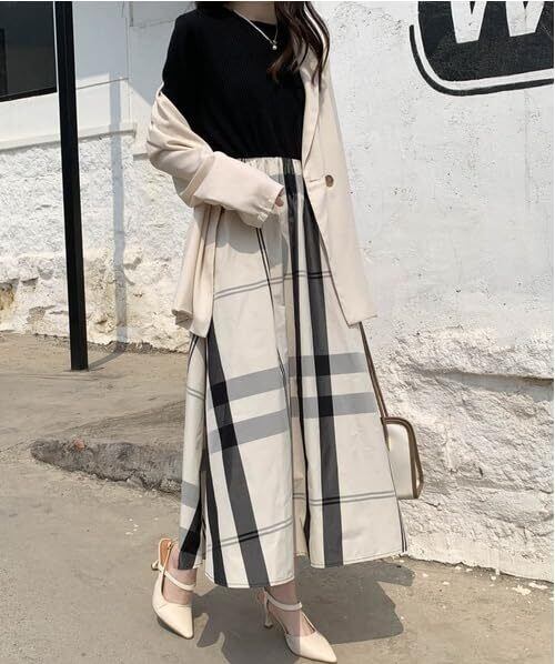 [KKAERDIYA] 大柄チェック切替ボリュームフレアワンピース ロング ドレス ワンピース レディース