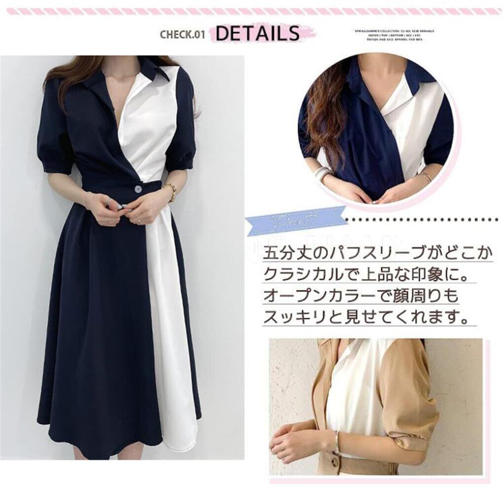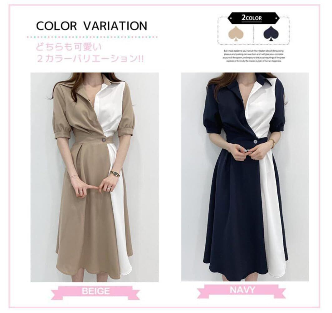バイカラーでの切り替えが目を引く、きれいめウエストマークワンピース。 五分丈のパフスリーブがどこかクラシカルで上品な印象に。 オープンカラーとウエストのタックデザインがきちんと見えし、お呼ばれワンピースとしても、スカートはふわっと広がるフレアシルエットでレディライクなデザイン。 結婚式の二次会やパーティー、謝恩会、食事会などのオケージョンからデイリーまで活躍する1枚です。