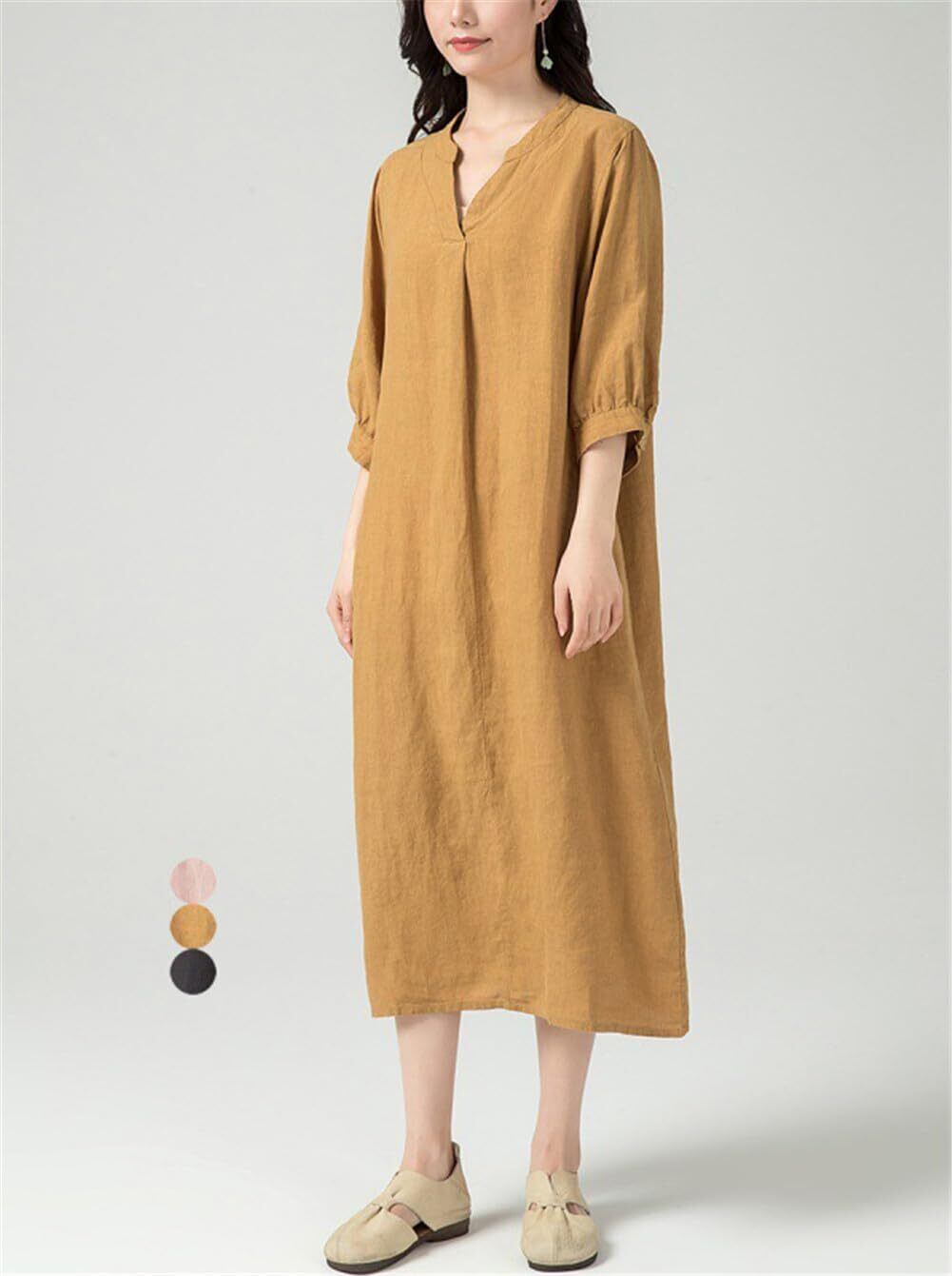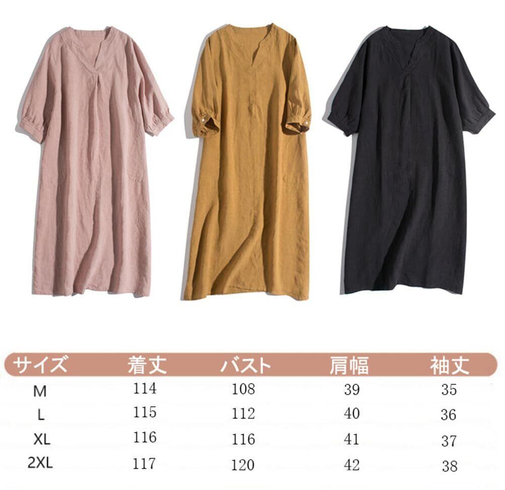 【特価商品】[H HUIMEI] ワンピース レディース 半袖 マキシワンピース 綿麻 無地 ドレス 森ガール 体型カバー 着痩せ 大きいサイズ ゆったり Vネック デート お出かけ 旅行 通勤 春 夏 (M イエロー) | BOSSO