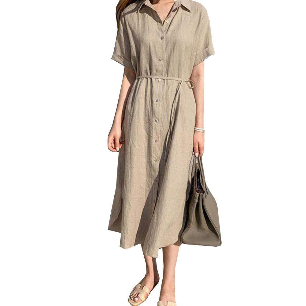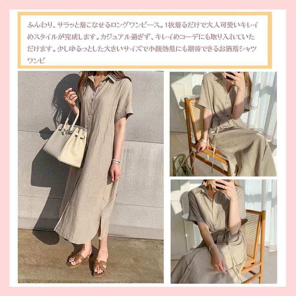 【新着商品】[H HUIMEI] シャツワンピース レディース リネン ロング丈 半袖 体型カバー ドレス Vネック着痩せ 大きいサイズ ゆったり Aライン 可愛い 春夏 お出かけ 部屋着 通勤 (XL) | BOSSO