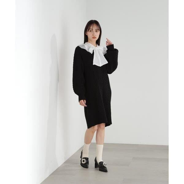 華やかなラッフルカラー付きニットワンピース。さまざまな柄編みをミックスして、縦ラインを強調してくれる一枚。大きなラッフル襟は取り外しができ、ゆるっと抜け感のあるニットワンピースとしても活躍します。※撮影時照明の関係により、色味が違って見える場合がございます。