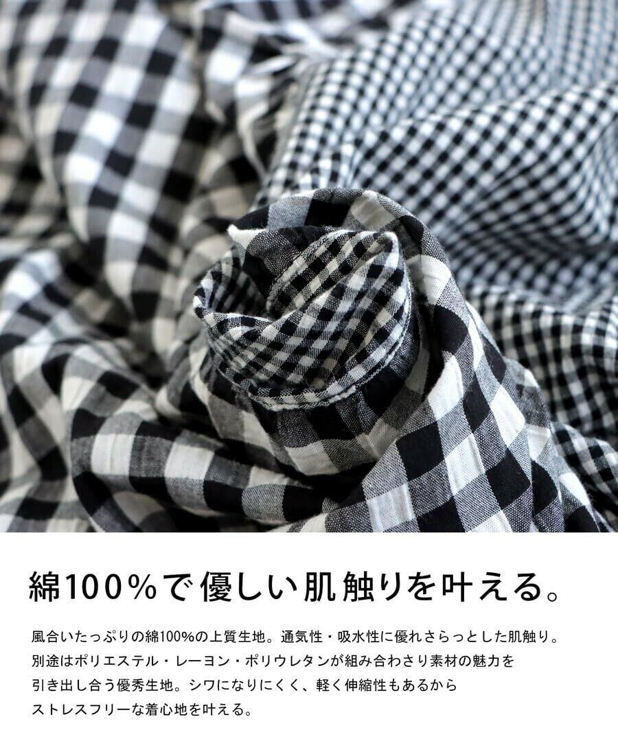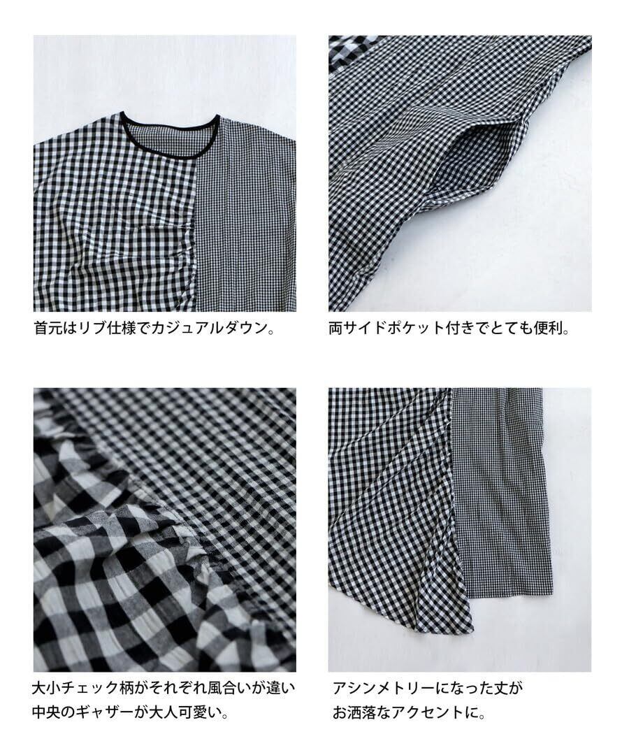 ≪DETAIL≫・ナチュラルな風合い漂う大小のチェック柄。・アクセントになるアシメデザイン。・大人可愛い印象の中央のギャザー。・首元はリブ仕様でカジュアルダウン。・顔回りがすっきり見えるネックライン。・便利な両サイドポケット付き。≪FABRIC≫・雰囲気高めるポコッとしたチェック柄。・しっかり丈夫な綿100%生地を使用。・通気性、吸水性に優れたさらっとした生地。・シワになりにくくデイリー使いしやすい◎・軽く伸縮性があり動きやすい。≪COLOR≫ブラックの1色展開。≪SIZE≫フリーサイズ。