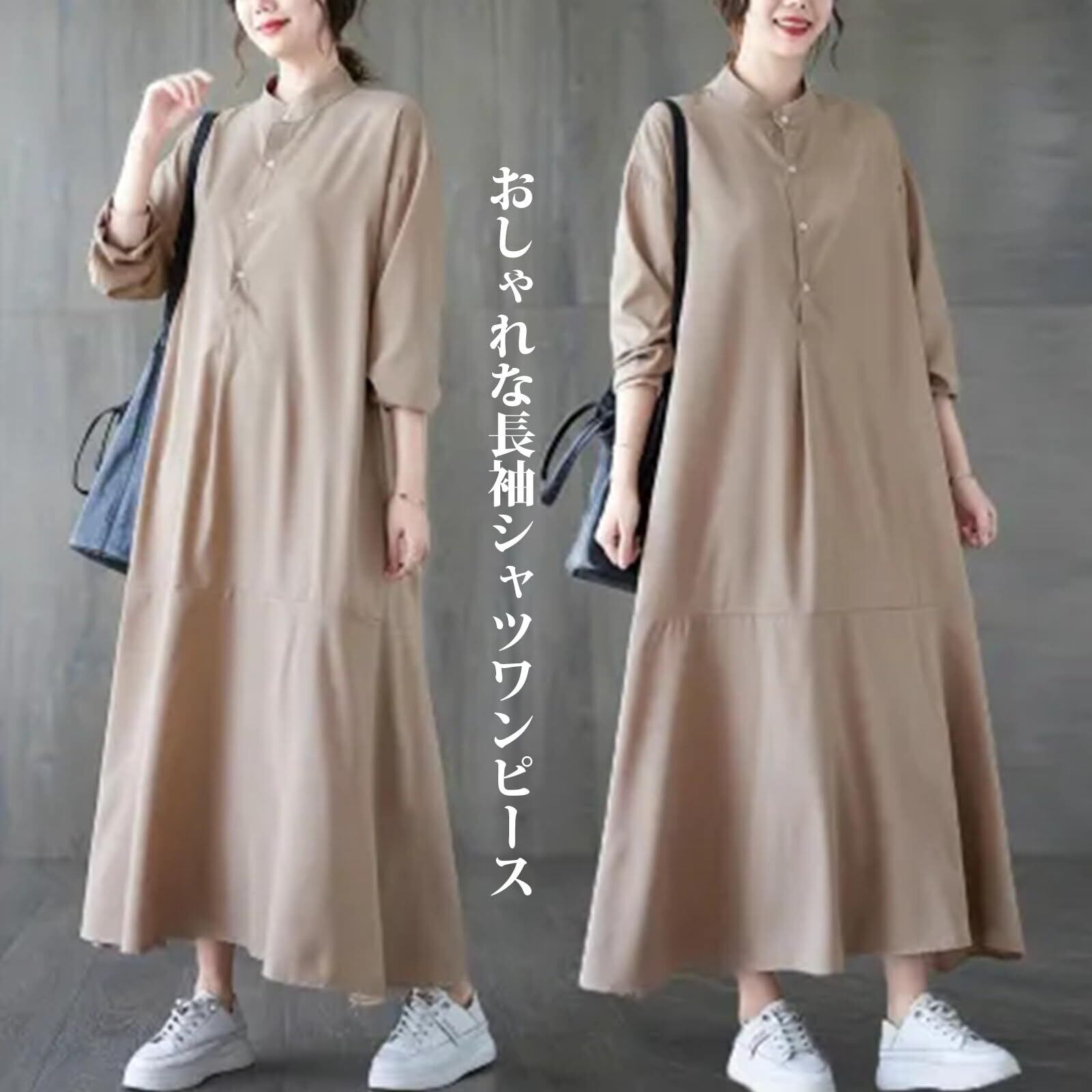 【在庫セール】[7-livehouse] ワンピース レディース シャツワンピース ロングワンピース 長袖 立ち襟 前開き 体型カバー Aライン ゆったり 無地 上品 おしゃれ デート カジュアル オフィス 通勤 春 秋 冬 | BOSSO