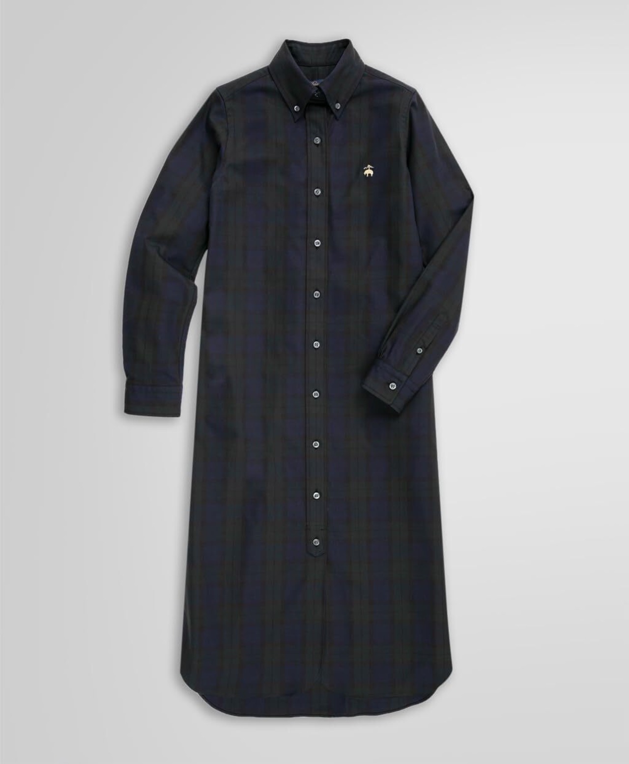 程よい厚みとマット感がある生地を使用し、温かみのある肌触りに仕上げました。トラッドを象徴するブラックウォッチ柄にゴールドのGF(ゴールデン フリース)マークを刺繍しました。ボタンダウンカラーにストレートなフィットのエフォートレスなシャツドレスなので、タイツやブーツとの相性も良く、長い期間着用できます。単品ではもちろん、フロントボタンを開けた重ね着スタイルもお薦めです。