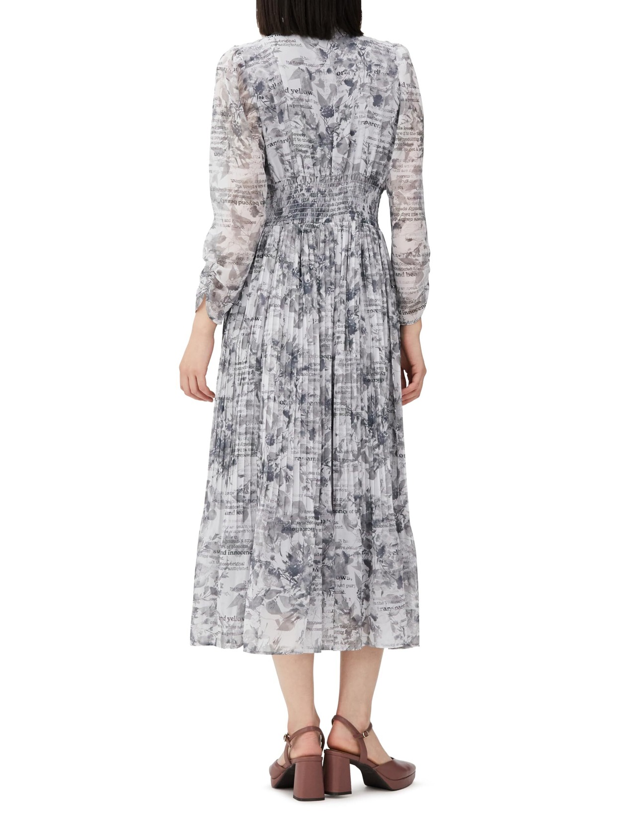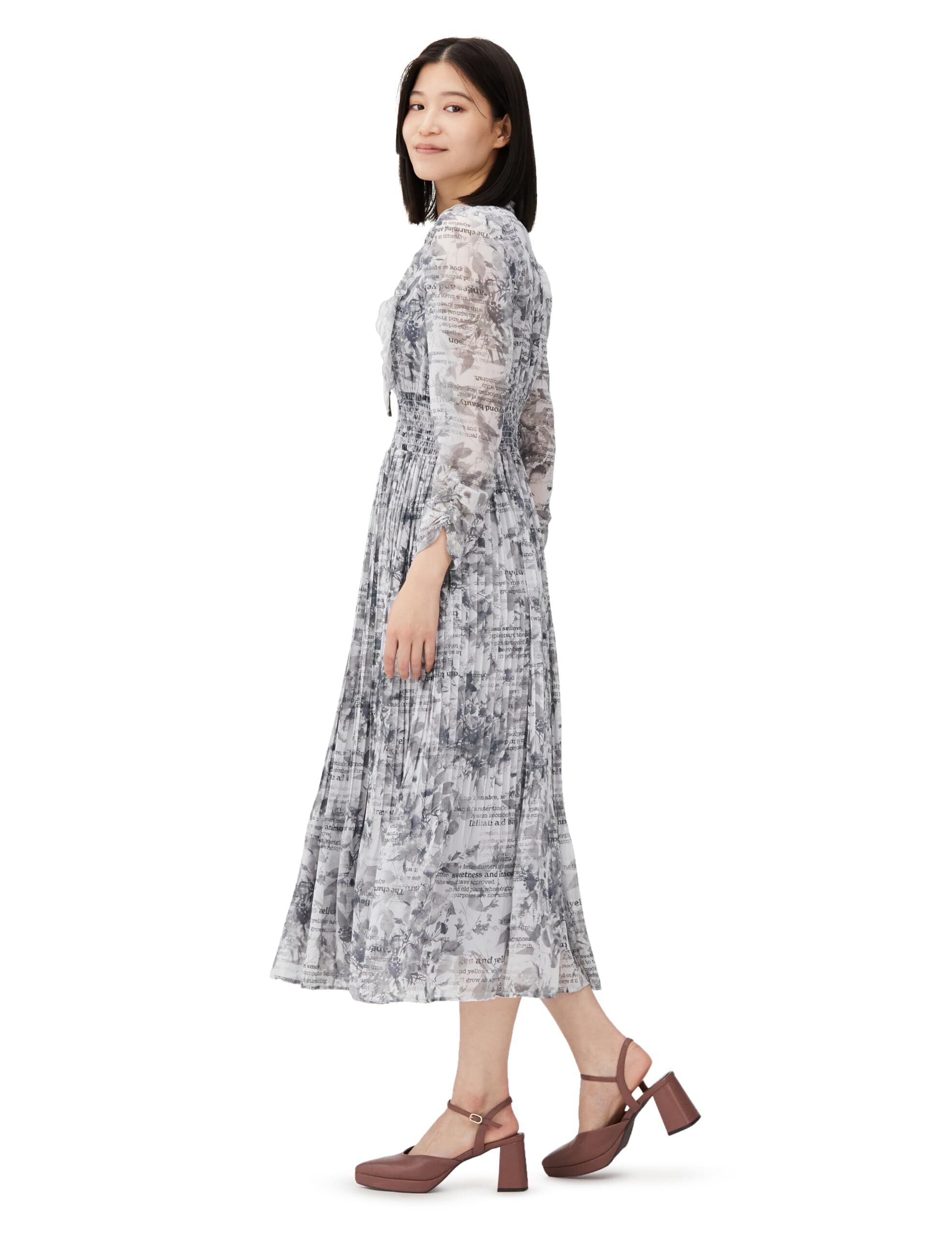 花柄とメッセージ性のあるロゴプリントをMIXした新鮮なワンピース。華奢なリボンタイ、ラッフル、タック、プリーツディテールを入れて一枚で華やぐデザイン。ラッフルのボリュームを抑えることで、甘すぎない大人なルックスに仕上げました。袖先にギャザーを入れて手先をほっそり見せます。ウエストはシャーリングゴムでメリハリをつけたシルエットを演出。※撮影時照明の関係により、色味が違って見える場合がございます。