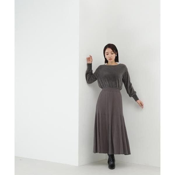 トップはショートシャギーのふんわりとした糸を使い、ボトムはさらりと着られる暖かみのあるマーメイドシルエットのニットスカートをドッキングしたデザインです。デコルテはほどよい鎖骨見せするネックライン、袖は抜け感のあるドルマンシルエットに。上下でワントーンスタイルが叶い、レイヤードしたような微配色が引き立つ大人フェミニンなワンピースです。