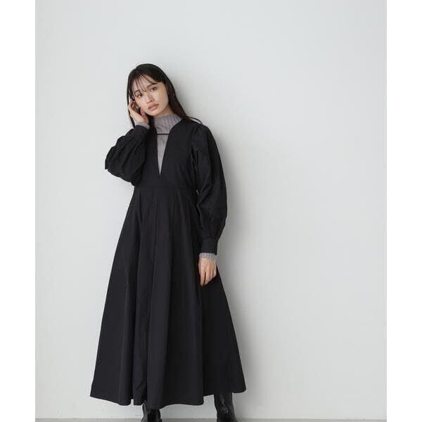 今年らしいデザインのギャザーを入れたパフ袖と、抜け感のあるフロントのディープスリットが引き立ち、一枚で着映えるワンピース。ハリのある素材で立体的なフォルムシルエットに仕上げています。構築したボリュームワンピースですが、ウエストはタックを入れて腰まわりをすっきり見せているので、着ぶくれ感を軽減してキレイなフィット&フレアシルエットを演出。シャープに開いた胸元なので、中に手持ちキャミソールなどのインナーと合わせてていただくと安心して着ていただけます。