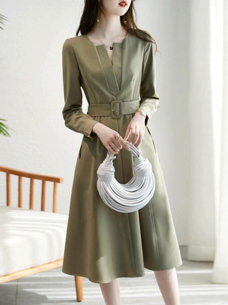 [Hemixewn] ワンピース レディース 秋 膝丈 長袖 ドレス リボンつき Vネック 体型カバー カジュアル おしゃれ 通勤