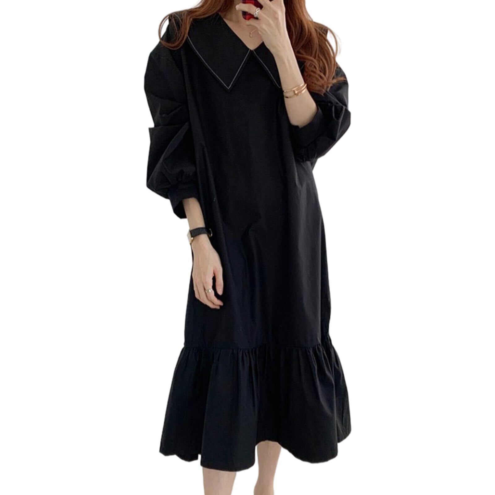 [7-livehouse] シャツワンピース レディース 長袖 ロング 折り襟 セーラーワンピース Vネック 無地 大きいサイズ 体型カバー 上品 可愛ら 着痩せ オフィス カジュアル 普段着 通勤 春 秋