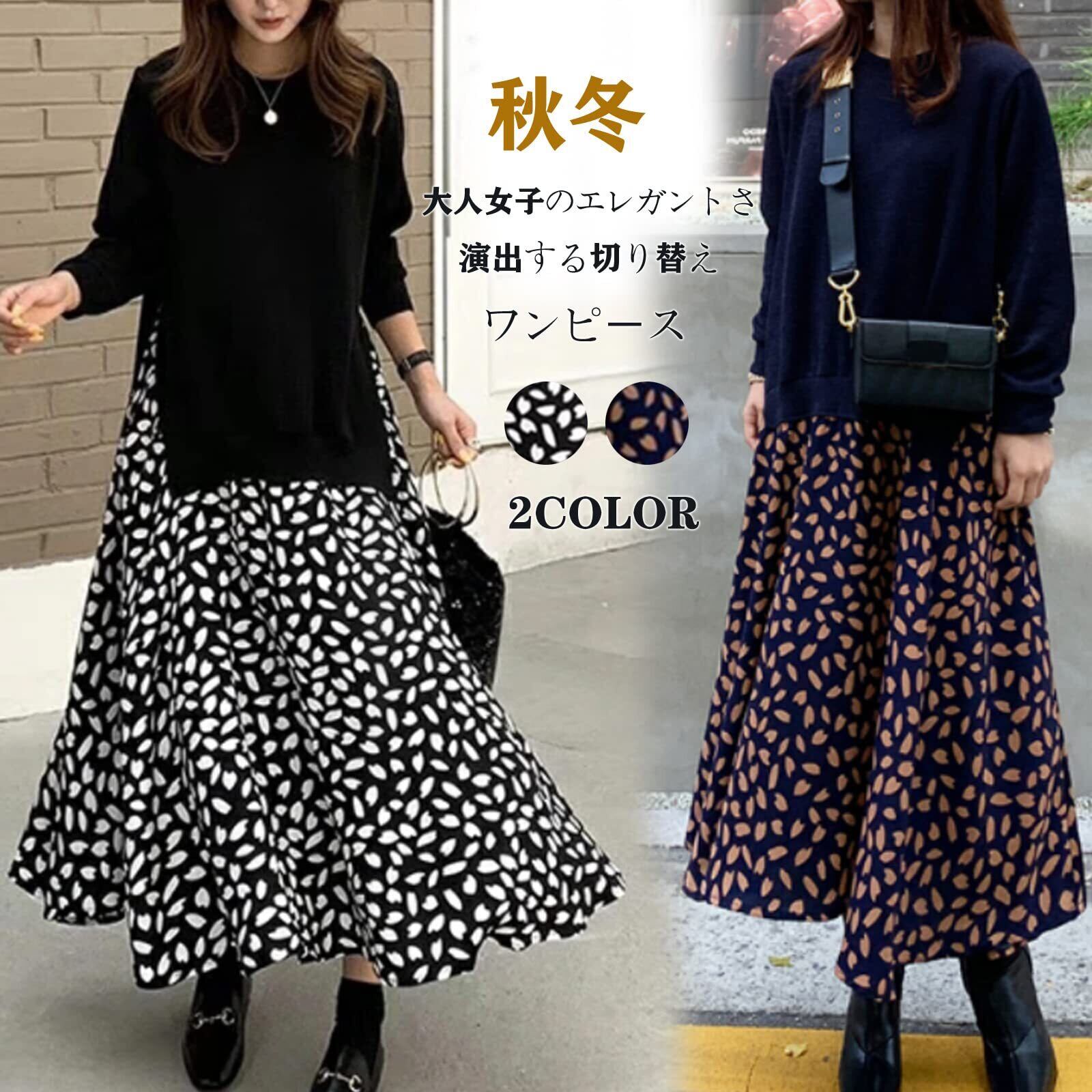 [7-livehouse] ワンピース レディース 秋冬 ロング ドッキングワンピース 長袖 切り替え きれいめ ゆったり 体型カバー 厚手 着痩せ かわいい 大人可愛い 通勤 オフィス 大きいサイズ