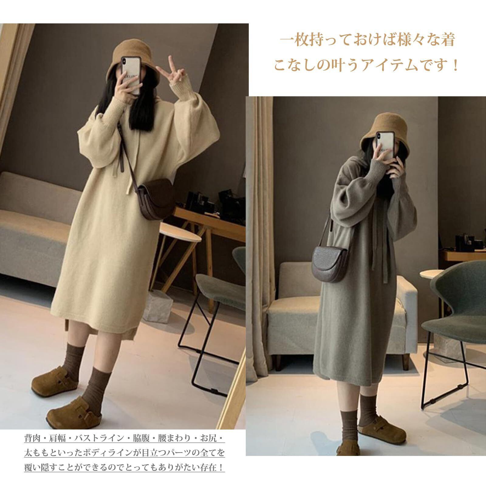 [NONELECEDOLE] ニットワンピース レディース 長袖 パーカーワンピース ミディアム丈 ストレートがた 無地 ゆったり 暖かい 着痩せ 体型カバー エレガント おしゃれ 部屋着 通勤 秋 冬