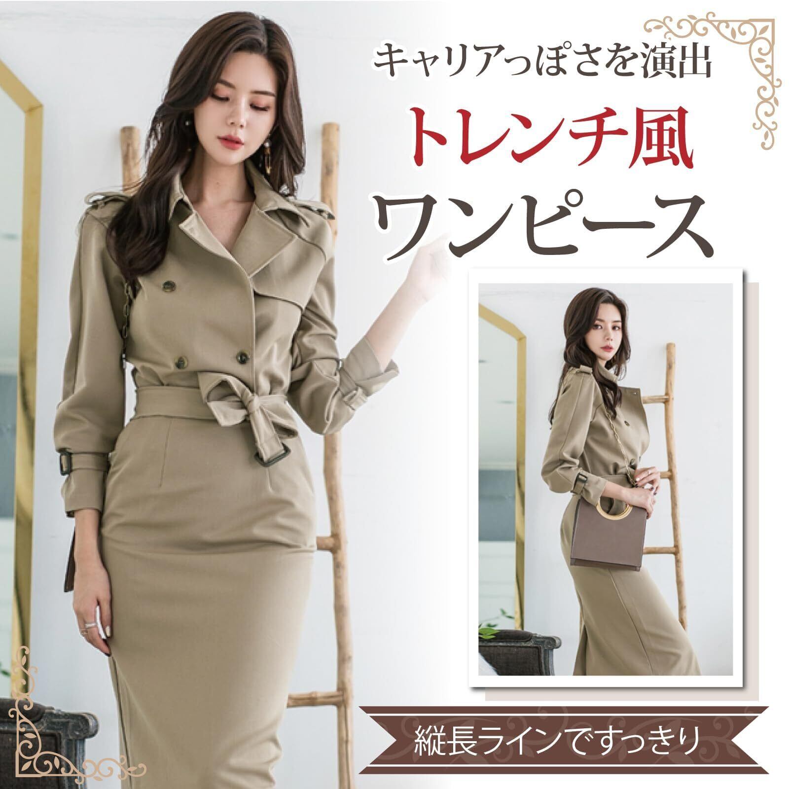 キャリアっぽさを演出するトレンチ風ワンピース(キャバドレス・CABARETDRESS)。付属のベルトはウエストマークでくびれを強調してくれてメリハリボディに。さらにストンと落ちる生地感と縦長ラインですっきり着痩せして見えるのもうれしいポイントです