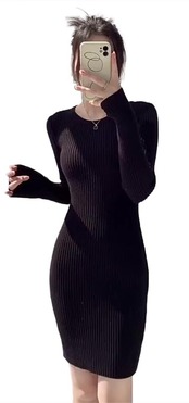[Hanmall] ニットワンピース ミニ タイト 無地 上品 FREE SIZE ラウンドネック 膝上 柔らか素材 秋 冬 セクシー ワンピース