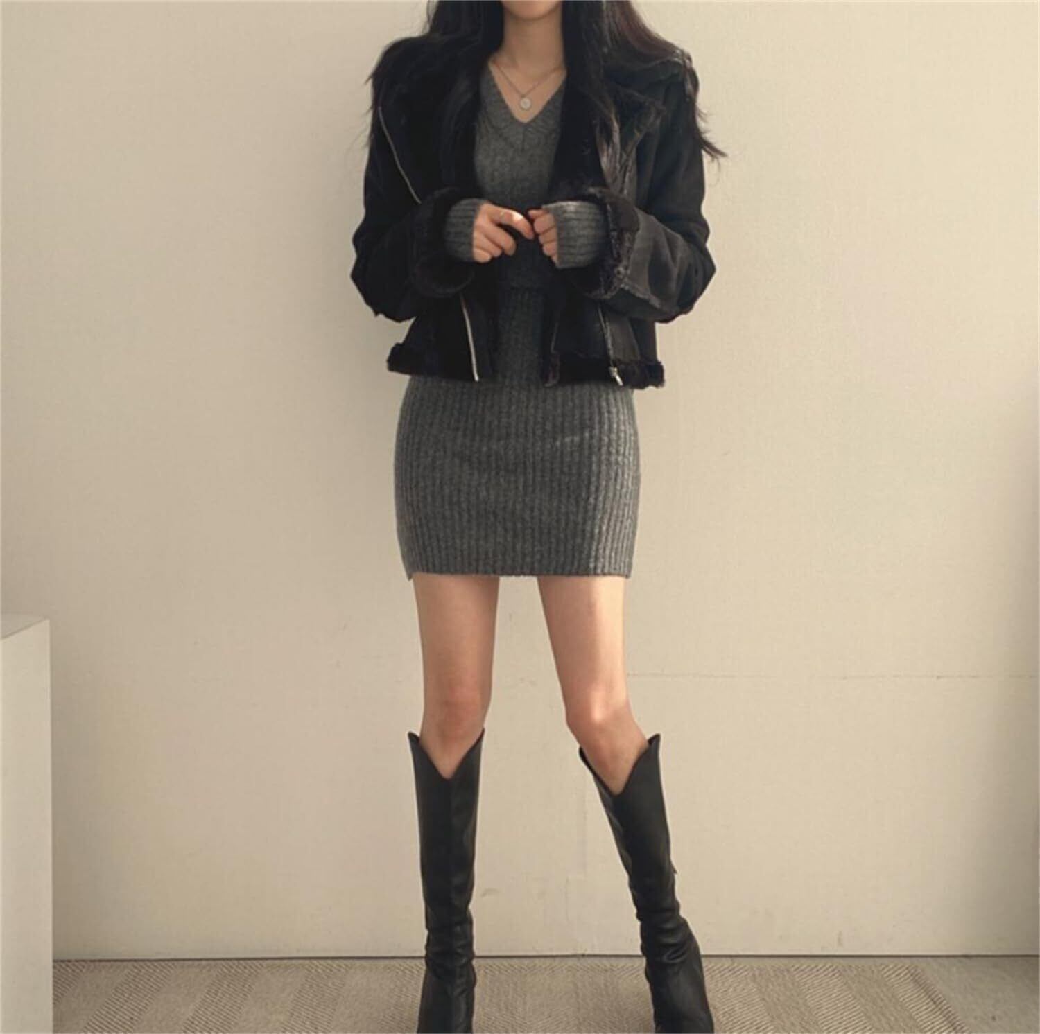 [kisetsumate] ニット ミニ ワンピース レディース セクシー ワンピース Vネック 長袖 タイトワンピース リブニット 人気 ファッション おしゃれ 重ね着