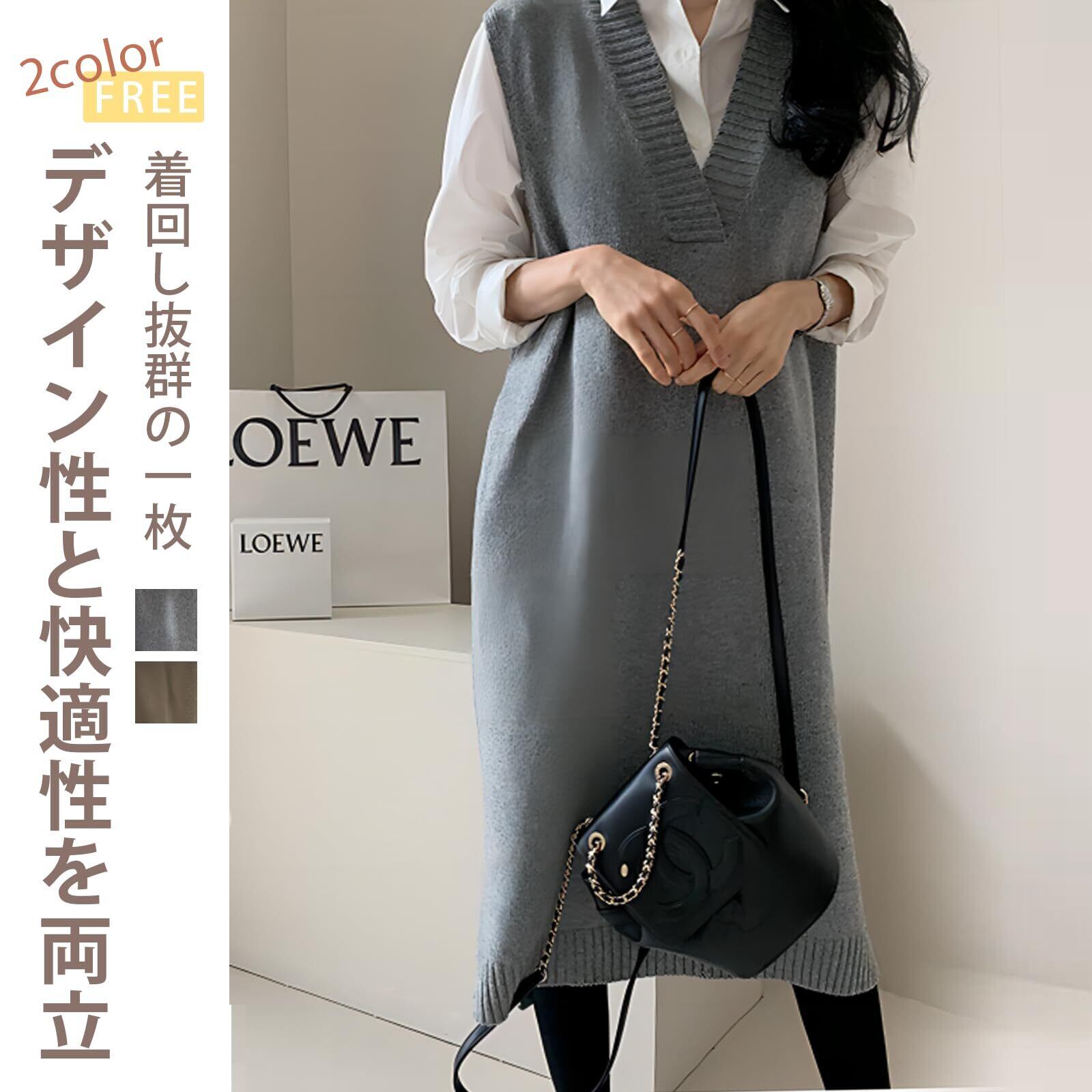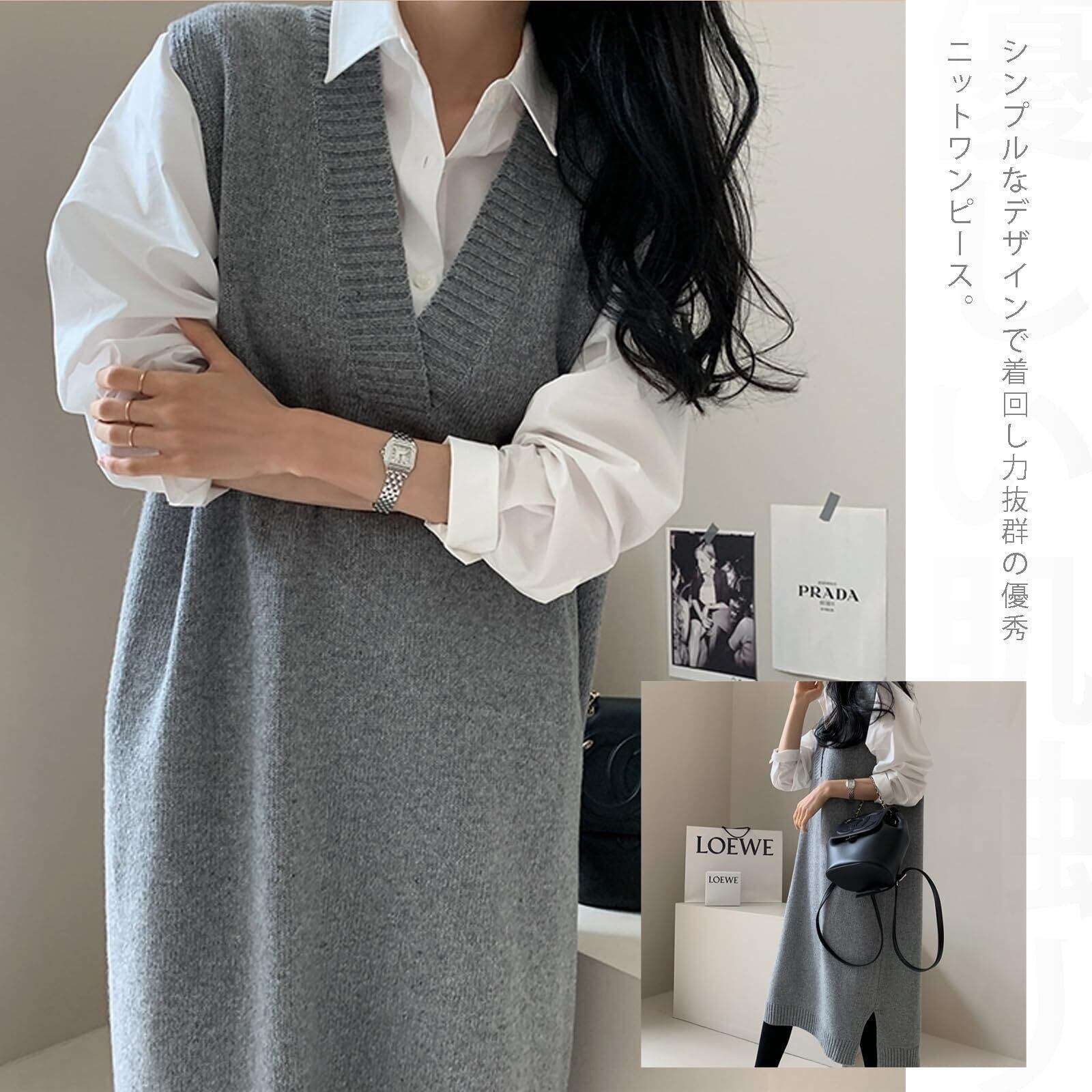 ワンピース レディース ニット Vネック ノースリーブ 可愛い かわいい お洒落 おしゃれ 無地 保温 防寒 着痩せ 体型カバー ひざ丈 カジュアル 通勤 オフィス 春 秋 冬