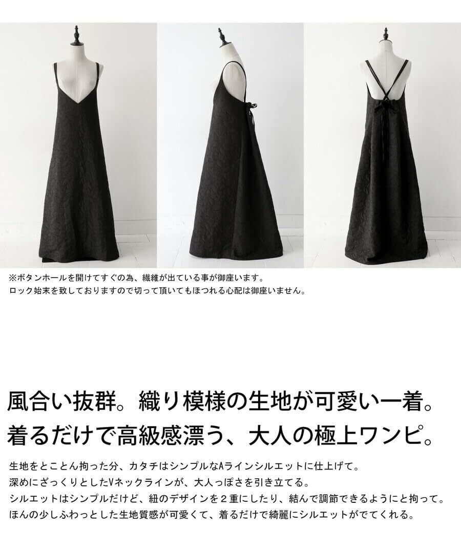 ≪DETAIL≫・大人可愛い印象の紐の二重デザイン。・縦のラインが強調される落ち感のあるシルエット。・顔回りが綺麗に見えるVネックライン。・身長やコーデに合わせて調節可能な肩紐。・便利な両サイドポケット付き。・着脱が楽ちんな後ろゴム。≪FABRIC≫・モードな雰囲気を惹き立てる立体的な柄。・ふんわりと優しい肌触り。・一枚でも安心の裾までの裏地付き。≪COLOR≫ブラックの1色展開。≪SIZE≫フリーサイズ。