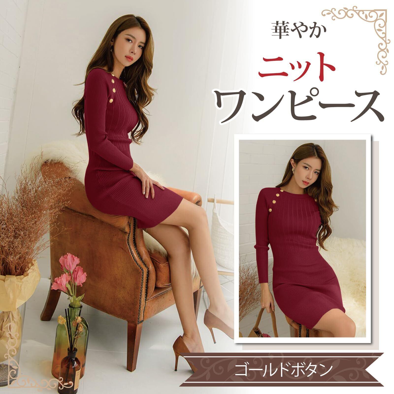 華やかゴールドボタンアクセントのニットワンピース(キャバドレス・CABARETDRESS)。鎖骨からアームに繋がるラインにゴールドボタンをあしらい、華やかさをプラスしたシンプルで飽きの来ない万能ワンピ。バストにボリュームを与えたストライプの切り返しでボディラインにメリハリを与えます。