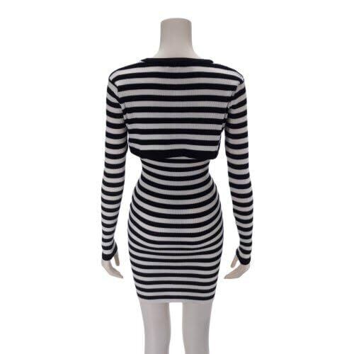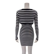 フロントカットアウトボーダーニットワンピース(キャバドレス・CABARETDRESS)。アンサンブルのトップスをワンピに重ねることで胸元をセクシーにアピール。タイトで薄手の生地が幅広いシーズンに着用可能です。