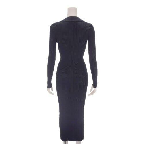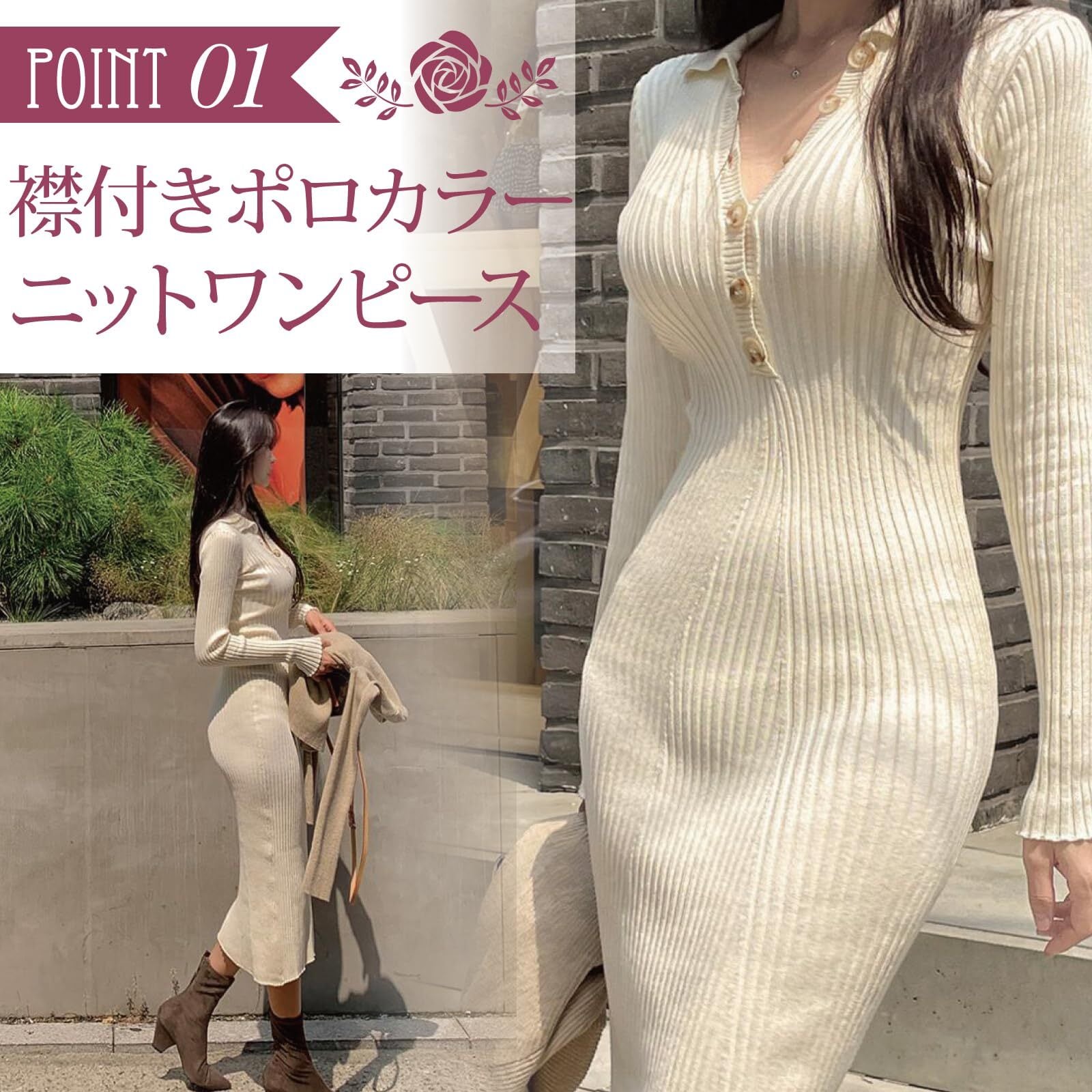 襟付きポロカラーロングニットワンピース(キャバドレス・CABARETDRESS)。ボタンの開閉で雰囲気が変わり、襟がカジュアルになりすぎないためパッと着やすいデザインです。リブニットでタイトなので女性らしいボディラインを強調。幅広いシーズンに着用いただけます。