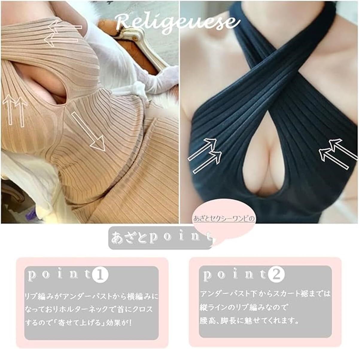 [Religeuses] クロス ホルターネック リブ ニット ワンピース 膝丈 バスト 魅せ セクシー ワンピ ノースリーブ レディース