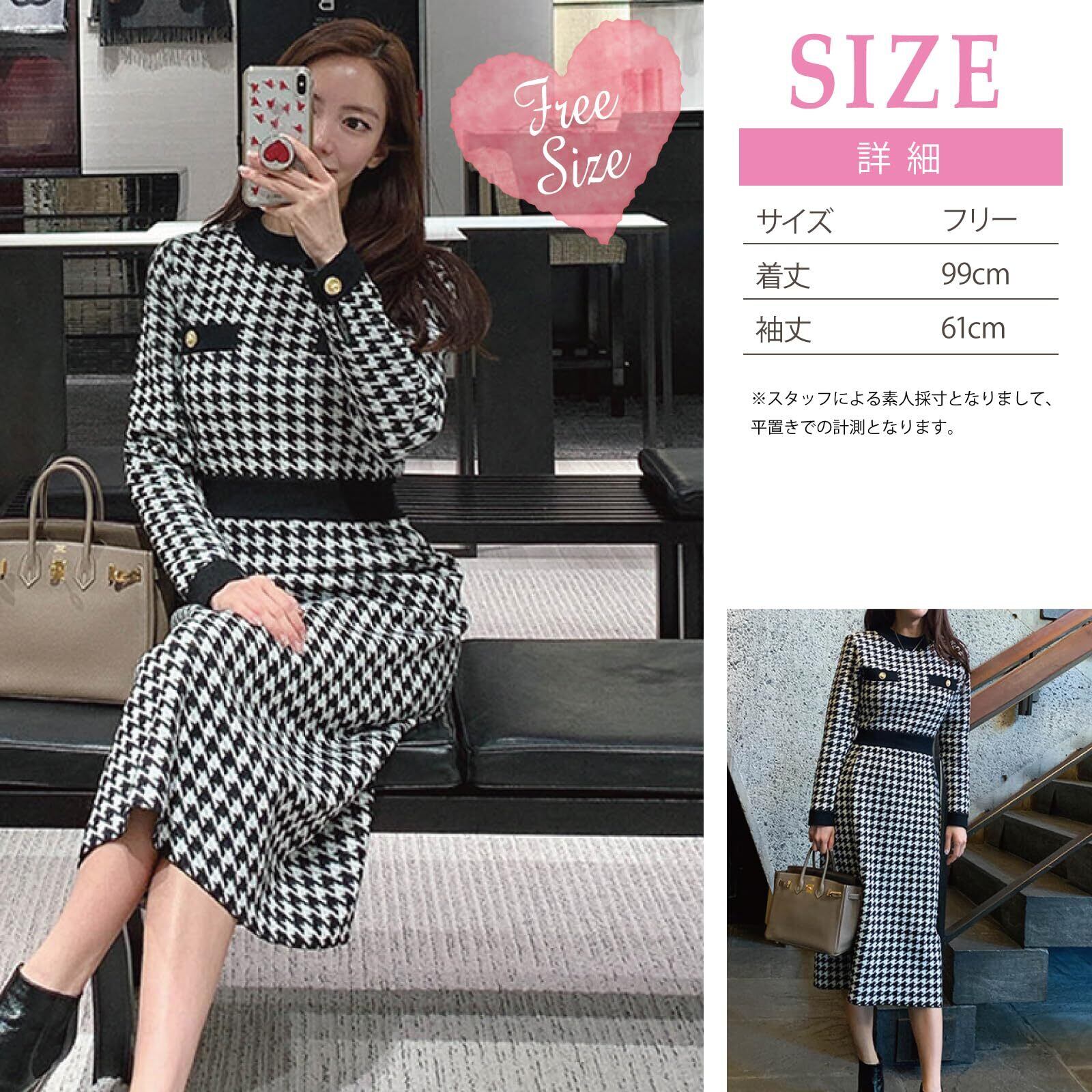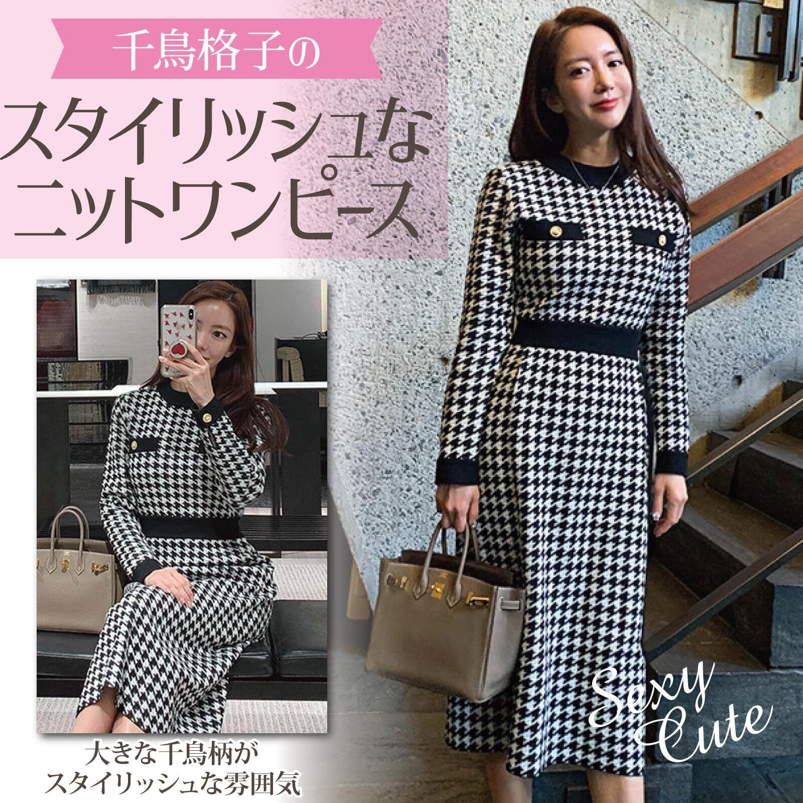 千鳥格子のミモレ丈ニットワンピース(キャバドレス・CABARETDRESS)。大きな千鳥柄がスタイリッシュな雰囲気。クルーネックが顔とのメリハリを付け、ゴールドボタンでエレガントながら、フェイクポケットで大人の遊び心を。バックにはスリットが入っているので動きやすく、重宝するワンピです。