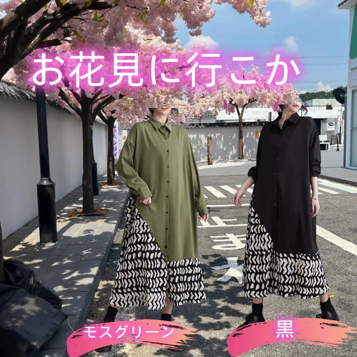 【2022最新】[YONGO] レディース 長袖シャツ ワンピース マキシ丈 ゆったり ロング丈ワンピース バイカラー オーバーサイズ 黒ワンピース 韓国ファッション 体型カバー 通勤 カジュアル 黒/モスグリーン 春物 ロングシャツ | BOSSO
