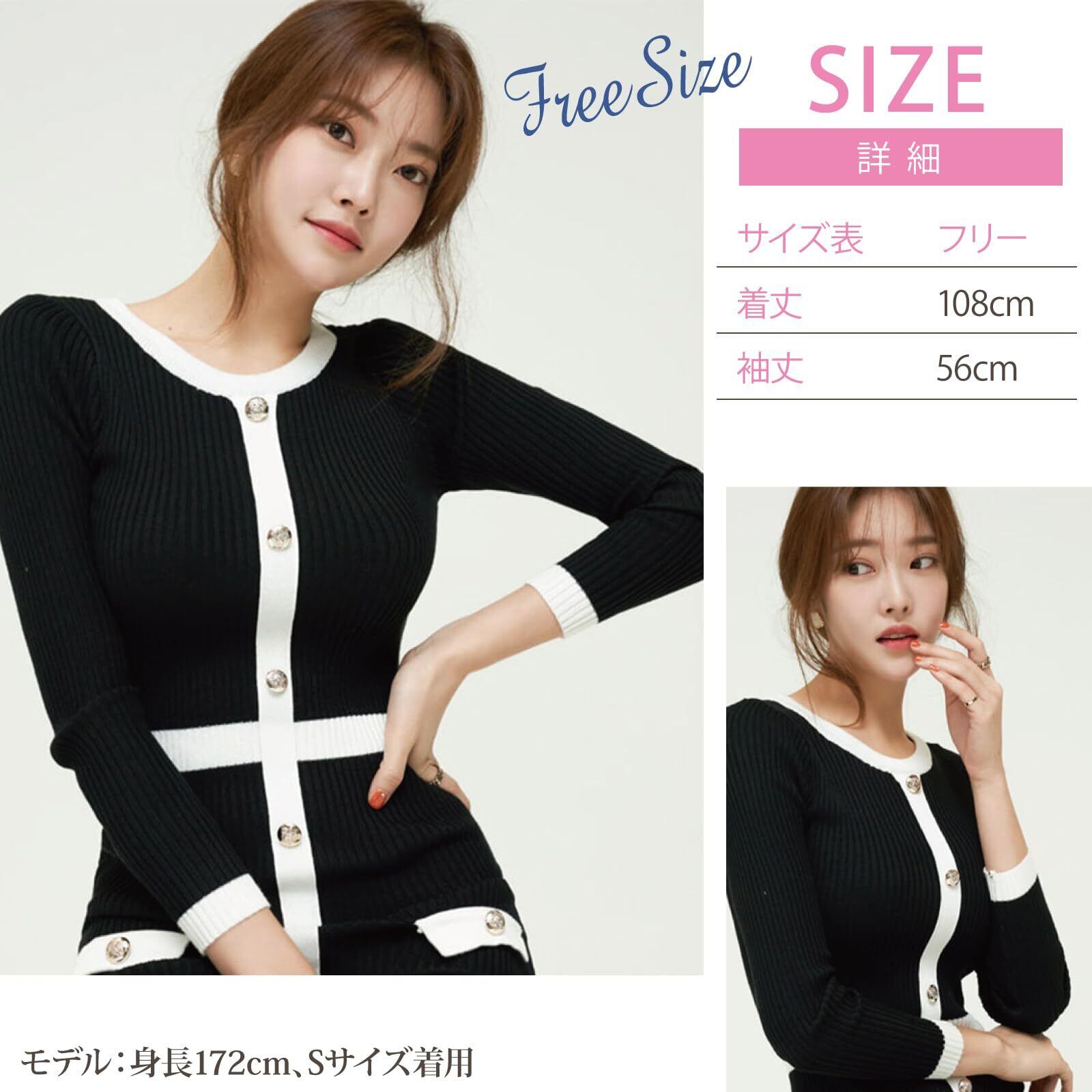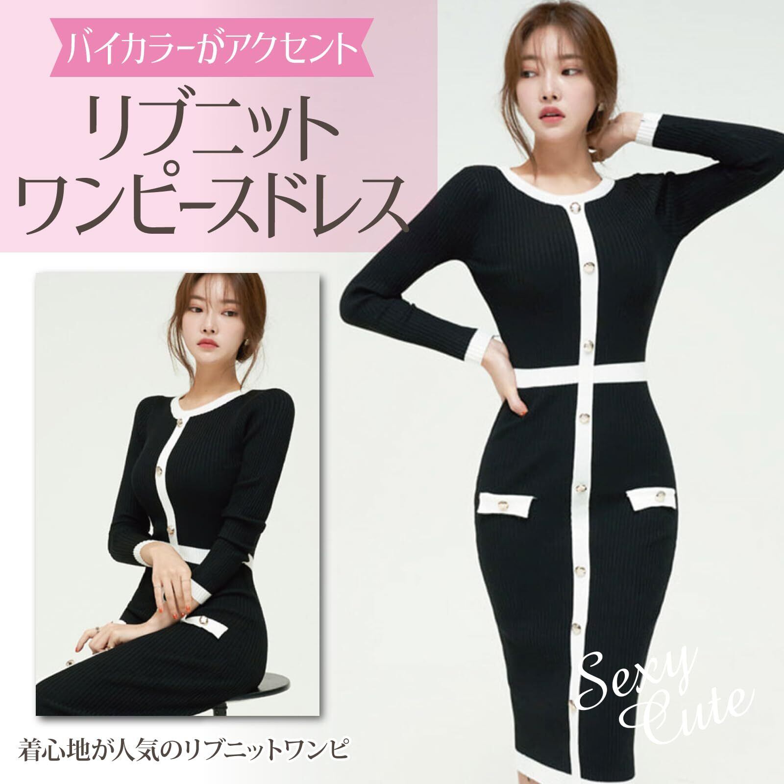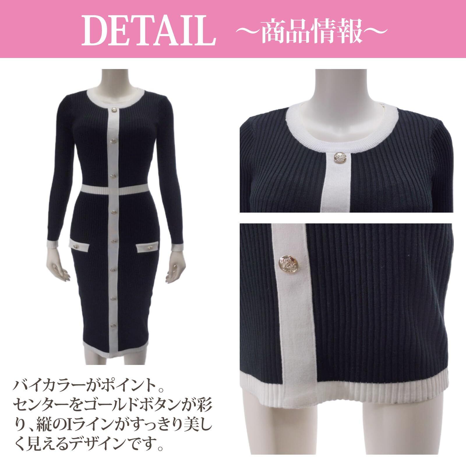 バイカラーがアクセントのリブニットワンピース(キャバドレス・CABARETDRESS)。伸縮性がありアクティブにも動ける着心地が人気のリブニットワンピです。バイカラーがポイントでセンターをゴールドボタンが彩り、縦のIラインがすっきり美しく見えるレディライクなデザインです。