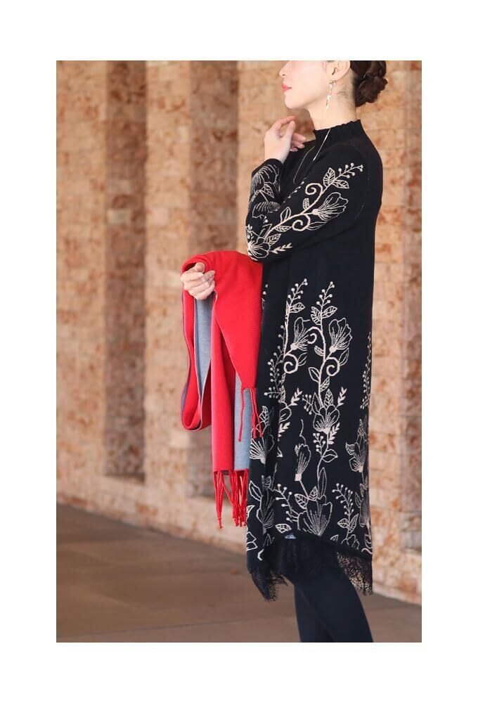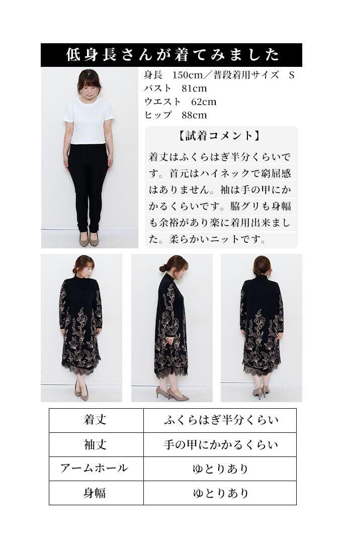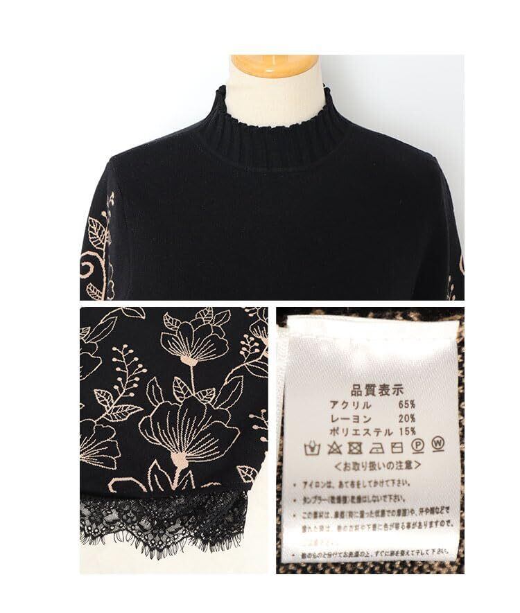[sawa á la mode] 草花 が 咲き 巡る 裾 レース ニット ワンピース レディース ファッション ワンピース ニット 黒 ブラック ミモレ丈 長袖 花柄