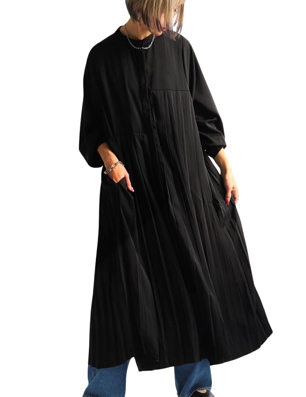 袖にもタックを入れてボリュームがあり華やかなプリーツワンピース。締め付け感のないゆったりとした着心地で、普段使いにもピッタリな一押しアイテム。