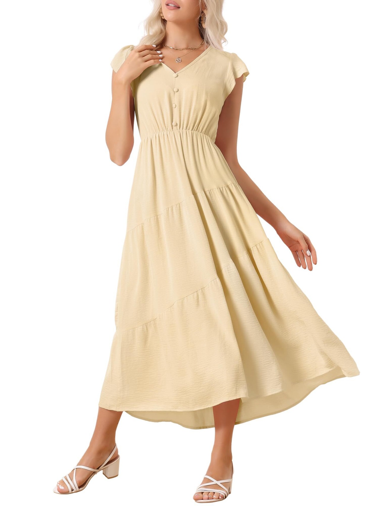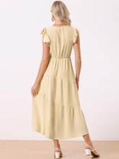 [Allegra K] ワンピース 夏 可愛い Vネック 半袖 フリル ゴムウエスト ビーチ ロング マキシ ドレス レディース