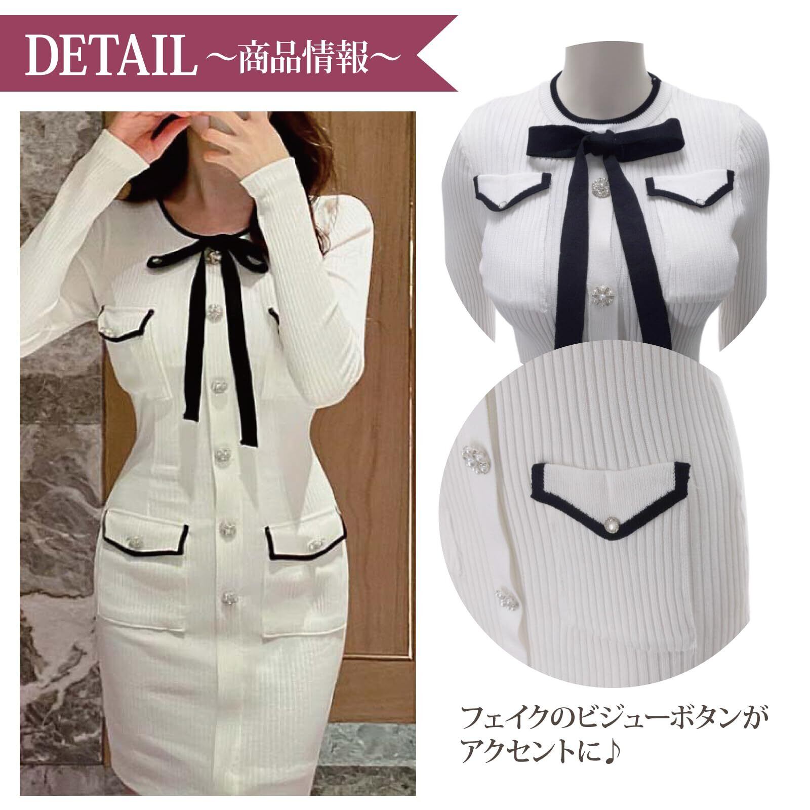 バイアカラーミニ丈ニットワンピース(キャバドレス・CABARETDRESS)。フェイクのビジューボタンが縦のラインをすっきりきれいに魅せ、脱着可能な胸元のリボンが清楚な雰囲気に。ニットの伸縮性とバイアカラーがボディラインにメリハリを付けてくれます。