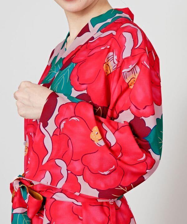 鮮やかな色使いとレトロな椿の柄が可愛らしいワンピース。着物のような合わせ衿で、和の要素を取り入れました。シャリ感のある素材で、季節問わず着ていただけます。サイドにポケット付き。ウエストベルト付き。