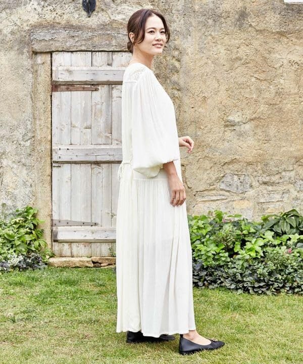 ボリュームたっぷりのワンピース。レーヨンクレープの落ち感がリラックスした雰囲気です。デコルテ部分のレースづかいが素敵。裾が歩くたびにふわりと広がり、軽やかな印象です。マキシ丈なので一枚でおしゃれに着ていただけます。嬉しいポケット付き。デイリーに活躍します。インナーワンピース付き。